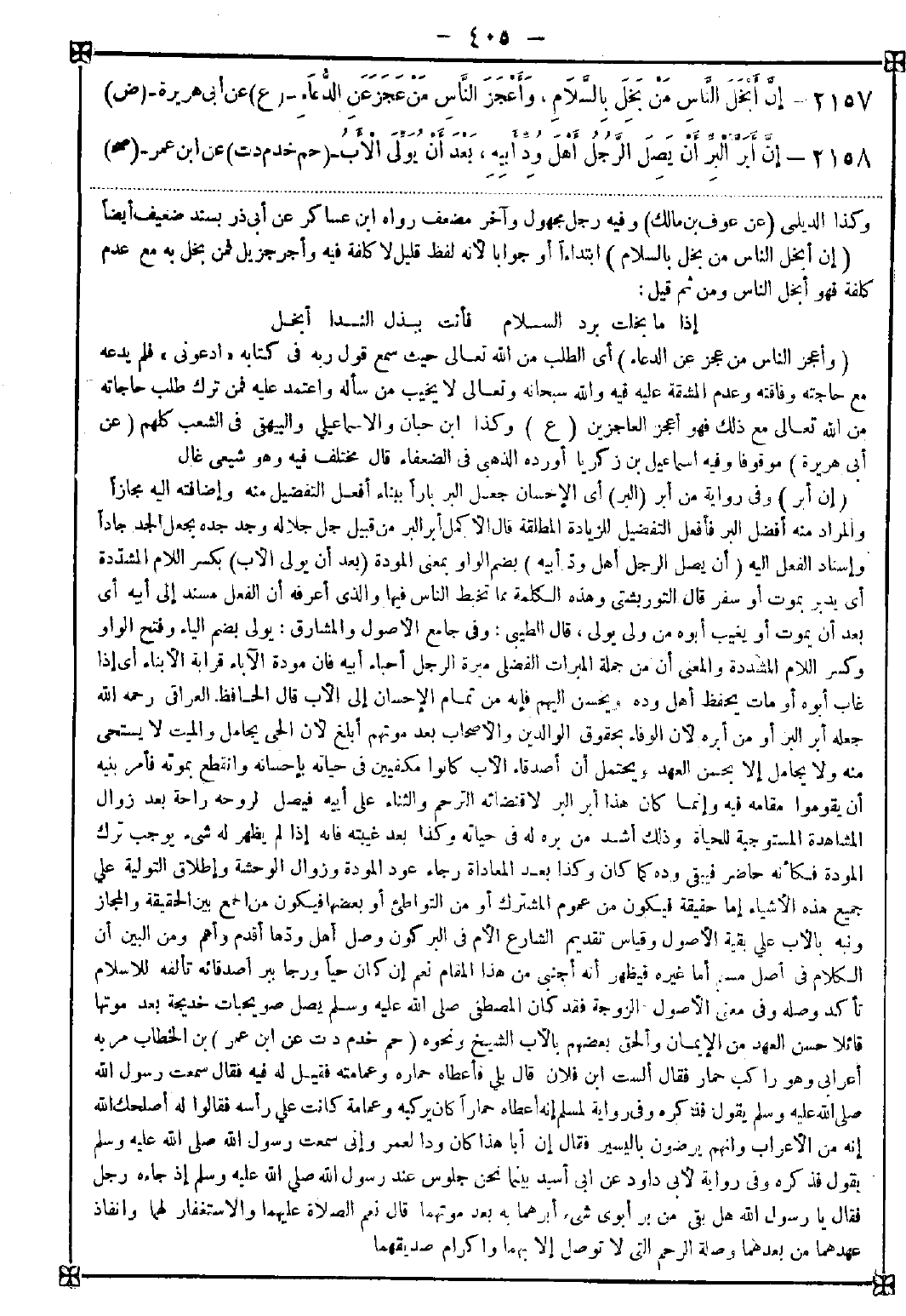 2157 - (إن أبخل الناس من بخل بالسلام) ابتداءا أو جوابا لأنه لفظ قليل لا كلفة فيه وأجر جزيل فمن بخل به مع عدم كلفة فهو أبخل الناس ومن ثم قيل: