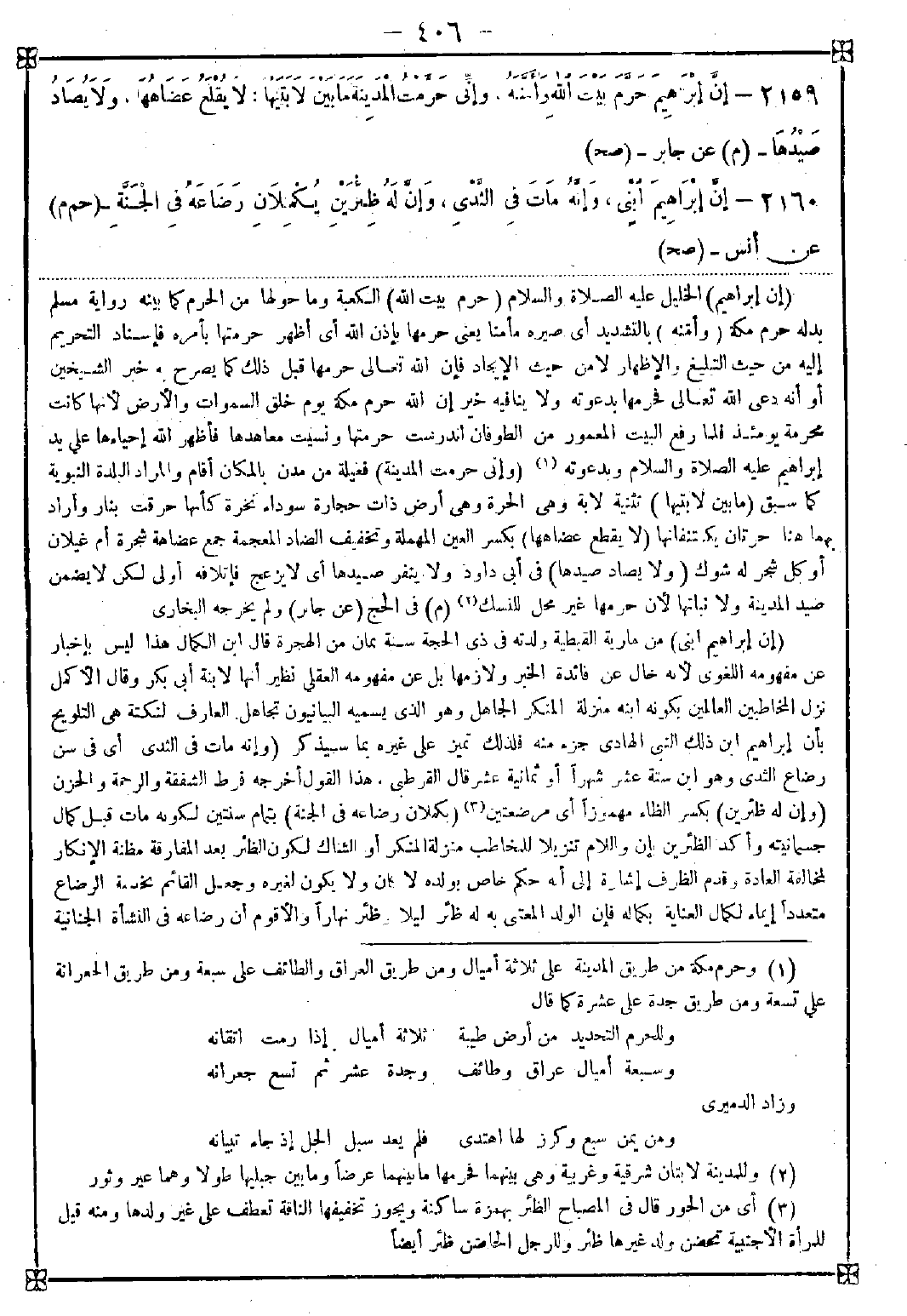 -[406]- 2159 - (إن إبراهيم) الخليل عليه الصلاة والسلام (حرم بيت الله) الكعبة وما حولها من الحرم كما بينه رواية مسلم بدله حرم مكة (وأمنه) بالتشديد أي صيره مأمنا يعني حرمها بإذن الله أي أظهر حرمتها بأمره فإسناد التحريم إليه من حيث التبليغ والإظهار لا من حيث الإيجاد فإن الله تعالى حرمها قبل ذلك كما يصرح به خبر الشيخين أو أنه دعى الله تعالى فحرمها بدعوته ولا ينافيه خبر إن الله حرم مكة يوم خلق السماوات والأرض لأنها كانت محرمة يومئذ فلما رفع البيت المعمور من الطوفان اندرست حرمتها ونسيت معاهدتها فأظهر الله إحياءها على يد إبراهيم عليه الصلاة والسلام وبدعوته (1) (وإني حرمت المدينة) فعيلة من مدن بالمكان أقام والمراد البلدة النبوية كما سبق (ما بين لابتيها) تثنية لابة وهي الحرة وهي أرض ذات حجارة سوداء نخرة كأنها حرقت بنار وأراد بهما هنا حرتان يكتنفانها (لا يقطع عضاهها) بكسر العين المهملة وتخفيف الضاد المعجمة جمع عضاهة شجرة أم غيلان أو كل شجر له شوك (ولا يضاد صيدها) في أبي داود ولا ينفر صيدها أي لا يزعج فإتلافه أولى لكن لا يضمن صيد المدينة ولا نباتها لأن حرمها غير محل للنسك (2)