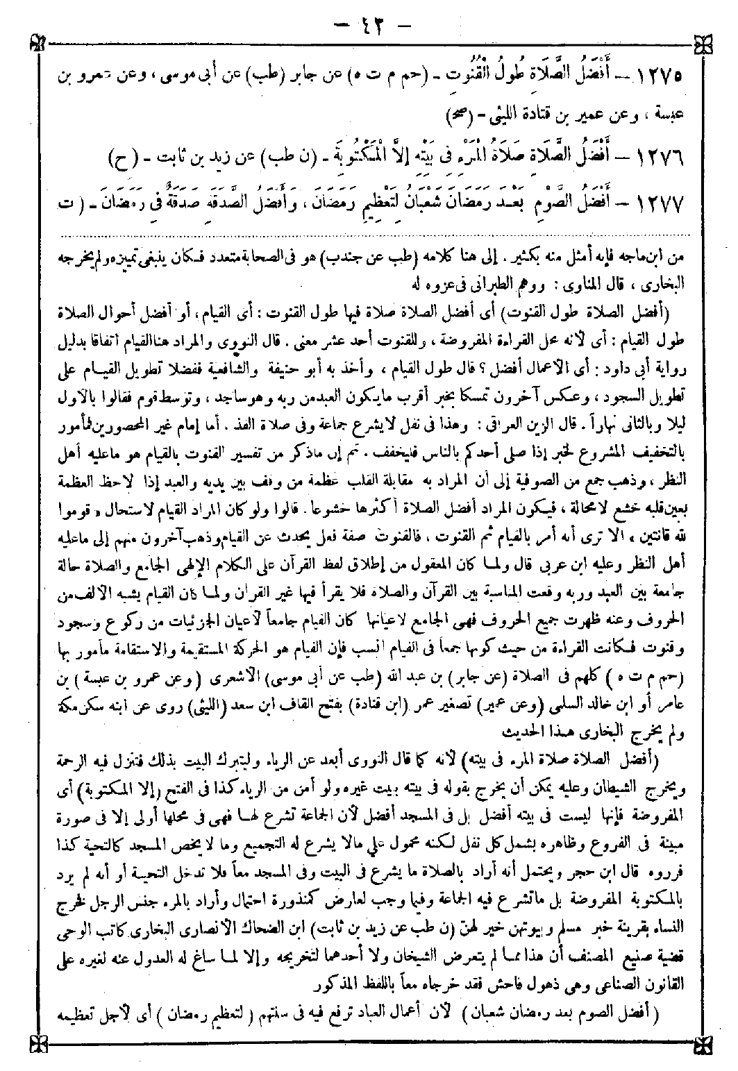 1276 - (أفضل الصلاة صلاة المرء في بيته) لأنه كما قال النووي أبعد عن الرياء وليتبرك البيت بذلك فتنزل فيه الرحمة ويخرج الشيطان وعليه يمكن أن يخرج بقوله في بيته ببيت غيره ولو أمن من الرياء كذا في الفتح (إلا المكتوبة) أي المفروضة فإنها ليست في بيته أفضل بل في المسجد أفضل لأن الجماعة تشرع لها فهي في محلها أولى إلا في صورة مبينة في الفروع وظاهره بشمل كل نفل لكنه محمول عليه ما لا يشرع له التجميع وما لا يخص المسجد كالتحية كذا قرروه. قال ابن حجر: ويحتمل أنه أراد بالصلاة ما يشرع في البيت وفي المسجد معا فلا تدخل التحية أو أنه لم يرد بالمكتوبة المفروضة بل ما تشرع فيه الجماعة وفيما وجب لعارض كمنذورة احتمال وأراد بالمرء جنس الرجل فخرج النساء بقرينة خبر مسلم وبيوتهن خير لهن