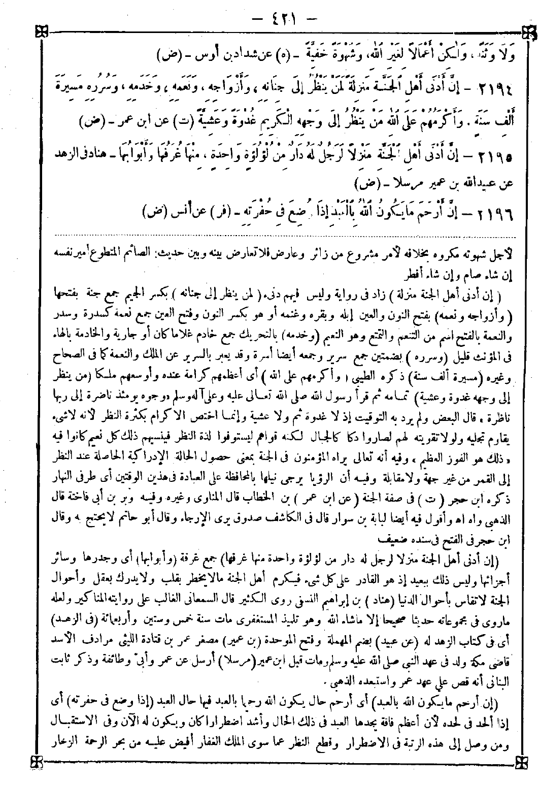 2194 - (إن أدنى أهل الجنة منزلة) زاد في رواية وليس فيهم دنيء (لمن ينظر إلى جنانه) بكسر الجيم جمع جنة وبفتحها (وأزواجه ونعمه) بفتح النون والعين إبله وبقره وغنمه أو هو بكسر النون وفتح العين جمع نعمة كسدرة وسدر والنعمة بالفتح اسم من التنعم والتمتع وهو النعيم (وخدمه) بالتحريك جمع خادم غلاما كان أو جارية والخادمة بالهاء في المؤنث قليل (وسرره) بضمتين جمع سرير وجمعه أيضا أسرة وقد يعبر بالسرير عن الملك والنعمة كما في الصحاح وغيره (مسيرة ألف سنة) ذكره الطيبي (وأكرمهم على الله) أي أعظمهم كرامة عنده وأوسعهم ملكا (من ينظر إلى وجهه غدوة وعشية) تمامه ثم قرأ رسول الله صلى الله تعالى عليه وعلى آله وسلم {وجوه يومئذ ناضرة إلى ربها ناظرة} قال البعض: ولم يرد به التوقيت إذ لا غدوة ثم ولا عشية وإنما اختص الإكرام بكثرة النظر لأنه لا شيء يقاوم تجليه ولولا تقويته لهم لصاروا دكا كالجبال لكنه قواهم ليستوفوا لذة النظر فينسيهم ذلك كل نعيم كانوا فيه {ذلك هو الفوز العظيم} وفيه أنه تعالى يراه المؤمنون في الجنة بمعنى حصول الحالة الإدراكية الحاصلة عند النظر إلى القمر من غير جهة ولا مقابلة وفيه أن الرؤيا يرجى نيلها بالمحافظة على العبادة في هذين الوقتين أي طرفي النهار ذكره ابن حجر
