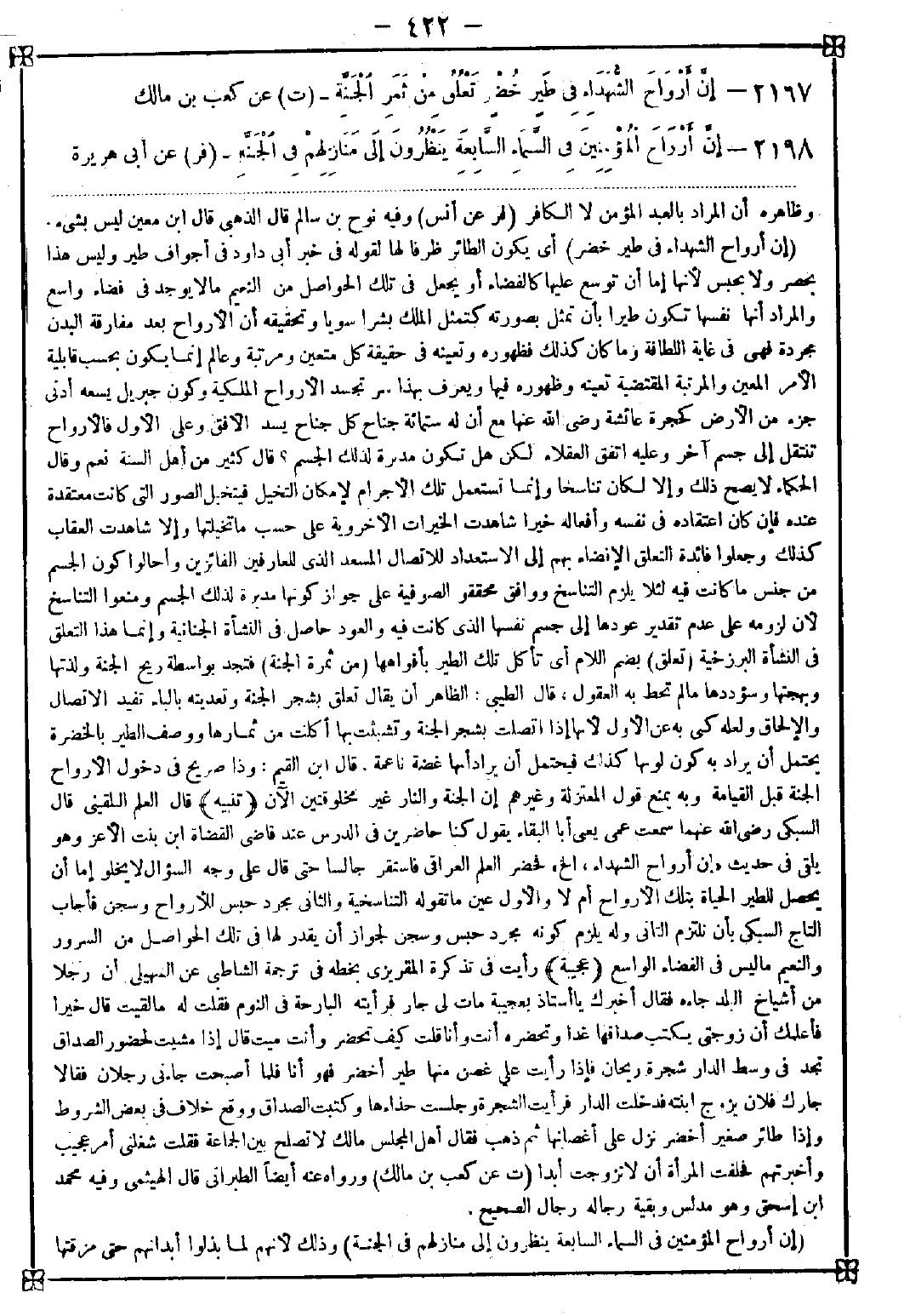 2198 - (إن أرواح المؤمنين في السماء السابعة ينظرون إلى منازلهم في الجنة) وذلك لأنهم لما بذلوا أبدانهم حتى مزقتها -[423]- أعداء الله شكر لهم ذلك بأن رفع محل أرواحهم وأدنى مقعدها قال في المطامح: الأصح ما ذكر في هذا الجزء من أن مقر الأرواح في السماء وأنها في حواصل طير ترتع في أشجار الجنة ولعلها مراتع مختلفة تكون الأرواح فيها بحسب درجاتها فالأعلى للأعلى وقال في النوادر: الأرواح شأنها عجيب هي خفيفة سماوية وإنما ثقلت بظلمة الشهوات فإذا ريضت النفس وتخلص الروح منها وصفت من كدورة النفس عادت لخفتها وطهارتها قال القاضي: وفيه وما قبله أن الإنسان غير الهيكل المحسوس بل هو مدرك بذاته لا يفنى بوفاة البدن ولا يتوقف عليه إدراكه وتأمله والتذاذه وقال الغزالي رحمه الله تعالى: الروح يطلق لمعنيين أحدهما جسم لطيف منبعه تجويف القلب الجسماني وينتشر بواسطة العروق الضوارب إلى جميع أجزاء البدن وجريانه وفيضان أنوار الحياة والحس منه على أعضائه يضاهي فيضان النور من السراج الذي يدار في زوايا البيت فإنه لا ينتهي إلى جزء من البيت إلا ويستنيره به فالحياة مثالها النور الحاصل في الحيطان والروح مثاله السراج وسريان الروح وحركته في الباطن مثال حركة السراج في زوايا البيت يتحرك بحركته والأطباء إذا أطلقوا الروح أرادوا هذا وهو بخار لطيف نضجته حرارة القلب وليس من غرض أطباء الدين شرحه بل المتعلق به غرضهم المعنى الثاني وهو اللطيفة العالية المدركة من الإنسان وهو أمر رباني عجيب يعجز أكثر العقول والأفهام عن إدراكه. وقال ابن الزملكاني: اختلف العقلاء في النفس والروح ويعنون به الذي يشير إليه كل أحد بقوله أنا ومنهم من يخص اسم النفس بهذا والروح بغيره وقد اضطربت المذاهب في ذلك اضطرابا كثيرا ومن يقول الروح هي النفس يحتج بقول بلال أخذ بنفسي الذي أخذ بنفسك مع قول النبي صلى الله عليه وسلم إن الله قبض أرواحنا وقوله تعالى {الله يتوفى الأنفس حين موتها والتي لم تمت في منامها} فلم يفرق بين الروح والنفس وفيه نظر والقول بأنها غير الروح يحتج بخبر إن الله خلق آدم عليه السلام وجعل فيه نفسا وروحا فمن الروح عفافه وفهمه وحلمه وسخاؤه ووقاره ومن النفس شهوته وطيشه وسفهه وغضبه وقال تعالى عن عيسى عليه الصلاة والسلام {تعلم ما في نفسي ولا أعلم ما في نفسك} ولا يحسن ذكر أحدهما في محل الآخر وقد جمع السهيلي بين الظواهر المختلفة بأن الروح مشتق من الريح وهو جسم هوائي لطيف به الحياة فإذا حصلت به الحياة كان روحا حتى يكتب أخلاقا ويقبل على مصالح الجسد فيسمى نفسا وبه يحصل الجواب عن الاحتجاج بالحدين الفارق بين الروح والنفس ثم نبه على التوسع حتى يطلق على الجسد والروح وحاصل ما ذكره يرجع إلى أن الروح لا يقال هي النفس مطلقا بل يفصل كما ذكر