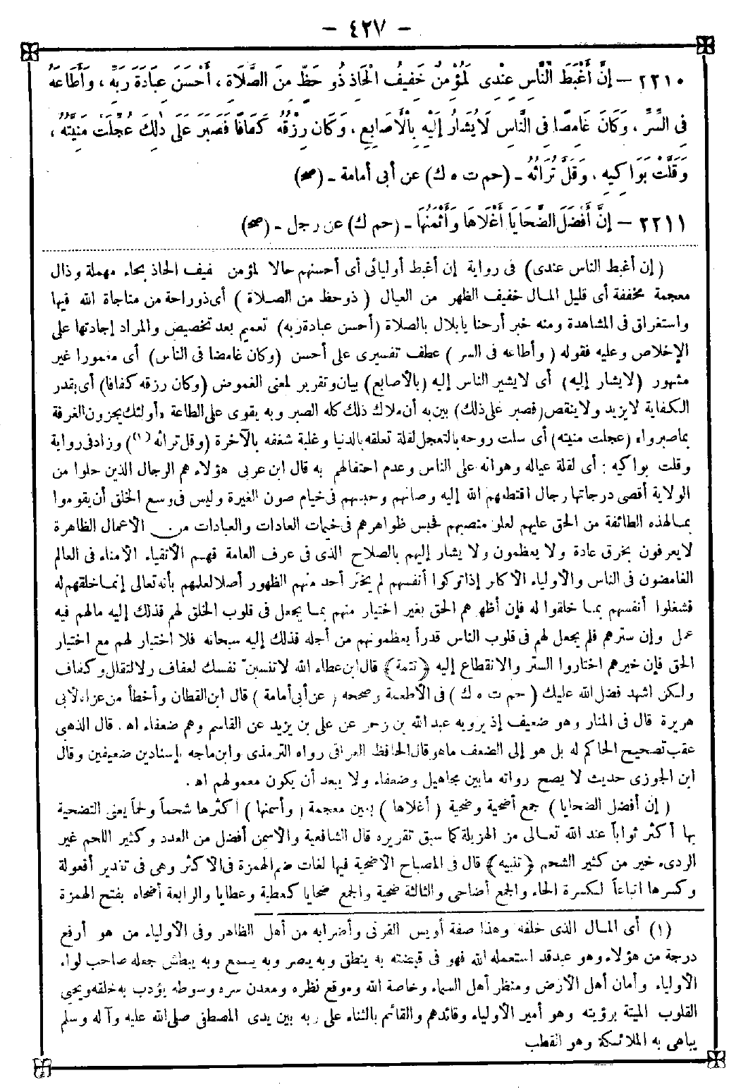 -[427]- 2210 - (إن أغبط الناس عندي) في رواية إن أغبط أوليائي أي أحسنهم حالا (لمؤمن خفيف الحاذ) بحاء مهملة وذال معجمة مخففة أي قليل المال خفيف الظهر من العيال (ذو حظ من الصلاة) أي ذو راحة من مناجاة الله فيها واستغراق في المشاهدة ومنه خبر أرحنا يا بلال بالصلاة (أحسن عبادة ربه) تعميم بعد تخصيص والمراد إجادتها على الإخلاص وعليه فقوله (وأطاعه في السر) عطف تفسيري على أحسن (وكان غامضا في الناس) أي مغمورا غير مشهور (لا يشار إليه) أي لا يشير الناس إليه (بالأصابع) بيان وتقرير لمعنى الغموض (وكان رزقه كفافا) أي بقدر الكفاية لا يزيد ولا ينقص (فصبر على ذلك) بين به أن ملاك ذلك كله الصبر وبه يقوى على الطاعة {أولئك يجزون الغرفة بما صبروا} (عجلت منيته) أي سلت روحه بالتعجل لقلة تعلقه بالدنيا وغلبة شغفه بالآخرة (وقل تراثه (1)) وزاد في رواية وقلت بواكيه: أي لقلة عياله وهوانه على الناس وعدم احتفالهم به قال ابن عربي: هؤلاء هم الرجال الذين حلوا من الولاية أقصى درجاتها رجال اقتطعهم الله إليه وصانهم وحبسهم في خيام صون الغيرة وليس في وسع الخلق أن يقوموا بما لهذه الطائفة من الحق عليهم لعلو منصبهم فحبس ظواهرهم في خيمات العادات والعبادات من الأعمال الظاهرة لا يعرفون بخرق عادة ولا يعظمون ولا يشار إليهم بالصلاح الذي في عرف العامة فهم الأتقياء الأمناء في العالم الغامضون في الناس والأولياء الأكابر إذا تركوا أنفسهم لم يختر أحد منهم الظهور أصلا لعلمهم بأنه تعالى إنما خلقهم له فشغلوا أنفسهم بما خلقوا له فإن أظهرهم الحق بغير اختيار منهم بما يجعل في قلوب الخلق لهم فذلك إليه ما لهم فيه عمل وإن سترهم فلم يجعل لهم في قلوب الناس قدرا يعظمونهم من أجله فذلك إليه سبحانه فلا اختيار لهم مع اختيار الحق فإن خيرهم اختاروا الستر والانقطاع إليه (تتمة) قال ابن عطاء الله: لا تنسبن نفسك لعفاف ولا لتقلل وكفاف ولكن اشهد فضل الله عليك