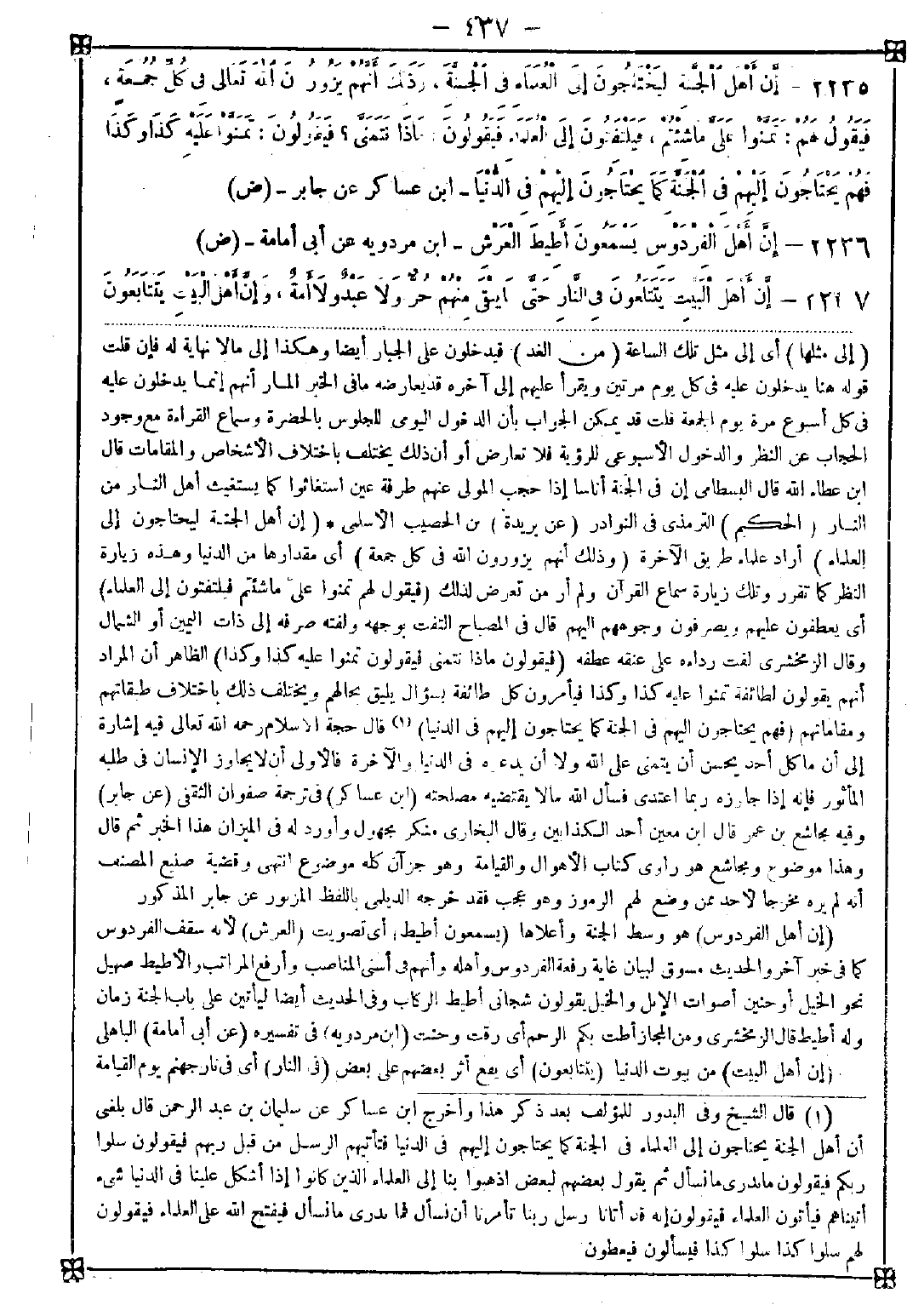 (1) قال الشيخ: وفي البدور للمؤلف بعد ذكر هذا وأخرج ابن عساكر عن سليمان بن عبد الرحمن قال: بلغني أن أهل الجنة يحتاجون إلى العلماء في الجنة كما يحتاجون إليهم في الدنيا فتأتيهم الرسل من قبل ربهم فيقولون سلوا ربكم فيقولون ما ندري ما نسأل ثم يقول بعضهم لبعض اذهبوا بنا إلى العلماء الذين كانوا إذا أشكل علينا في الدنيا شيء أتيناهم فيأتون العلماء فيقولون إنه قد أتانا رسل ربنا تأمرنا أن نسأل فما ندري ما نسأل فيفتح الله على العلماء فيقولون لهم سلوا كذا سلوا كذا فيسألون فيعطون