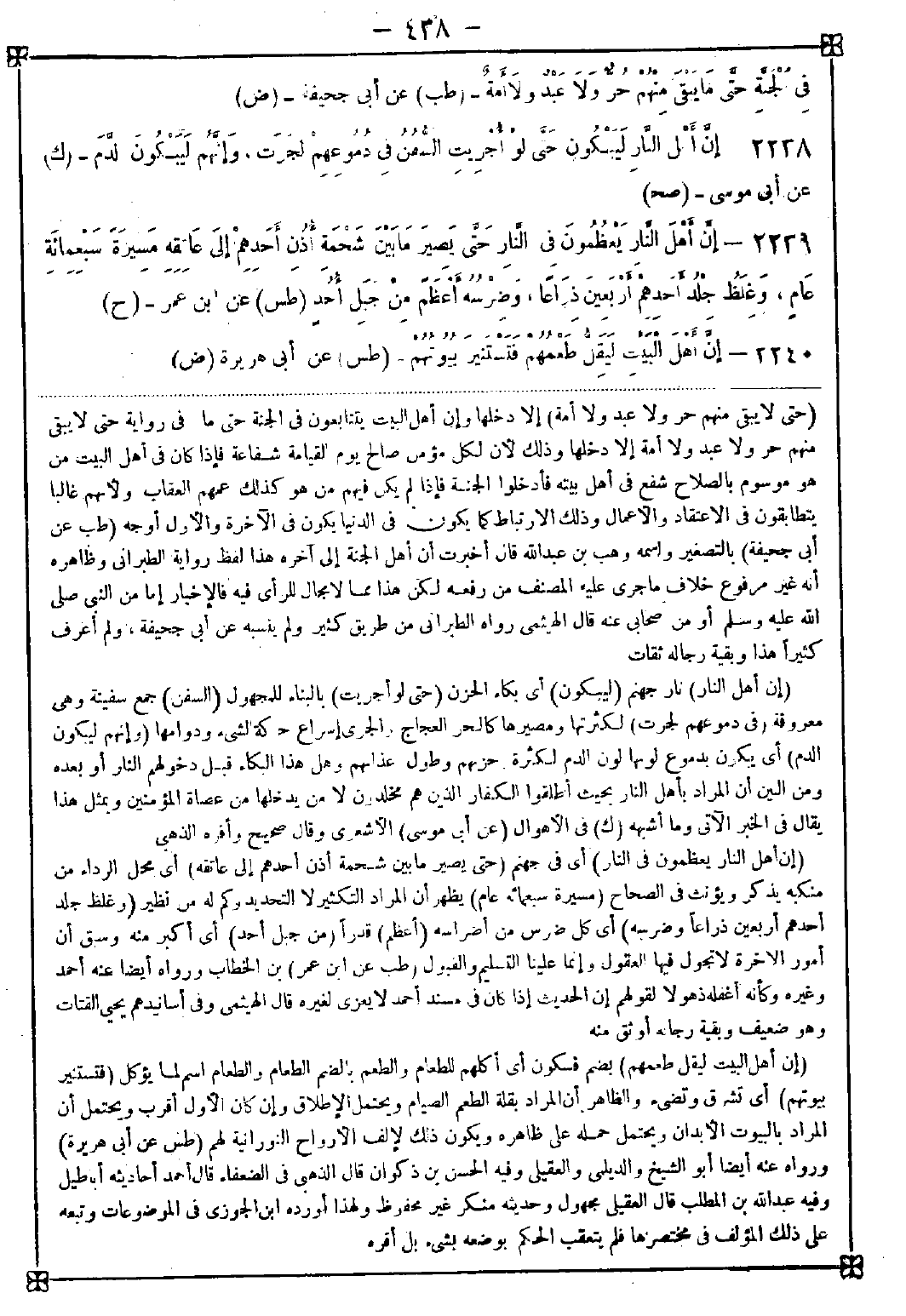 2238 - (إن أهل النار) نار جهنم (ليبكون) أي بكاء الحزن (حتى لو أجريت) بالبناء للمجهول (السفن) جمع سفينة وهي معروفة (في دموعهم لجرت) لكثرتها ومصيرها كالبحر العجاج والجري إسراع حركة الشيء ودوامها (وإنهم ليبكون الدم) أي يبكون بدموع لونها لون الدم لكثرة حزنهم وطول عذابهم وهل هذا البكاء قبل دخولهم النار أو بعده ومن البين أن المراد بأهل النار بحيث أطلقوا الكفار الذين هم مخلدون لا من يدخلها من عصاة المؤمنين وبمثل هذا يقال في الخبر الآتي وما أشبهه