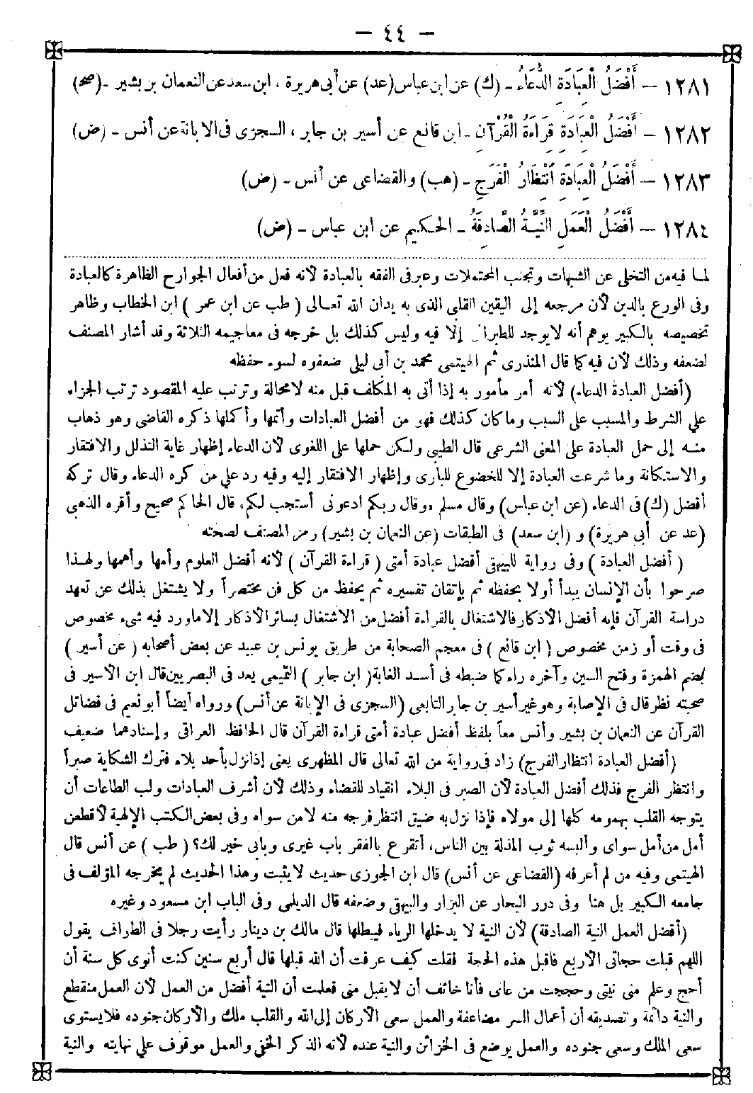 1281 - (أفضل العبادة الدعاء) لأنه أمر مأمور به إذا أتى به المكلف قبل منه لا محالة وترتب عليه المقصود وترتب الجزاء على الشرط والمسبب على السبب وما كان كذلك فهو من أفضل العبادات وأتمها