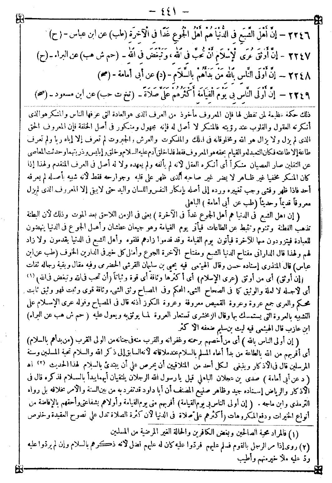 2247 - (إن أوثق) أي من أوثق (عرى الإسلام) أي أكثرها وثاقة أي قوة وثباتا (أن تحب في الله وتبغض في الله) (1) أي لأجله لا لعلة والوثيق كما في الصحاح الشيء المحكم وفي المصباح وثق الشيء وثاقة قوي وثبت فهو وثيق ثابت محكم والعرى جمع عروة وعروة القميص معروفة وعروة الكوز أذنه قال في المصباح: وقوله عرى الإسلام على التشبيه بالعروة التي يستمسك بها وقال الزمخشري تستعار العروة لما يوثق به ويعول عليه