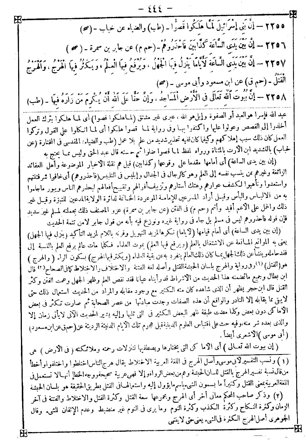 (1) ونسب التفسير لأبي موسى وأصل الهرج في اللغة العربية الاختلاط يقال هرج الناس اختلطوا واختلفوا وأخطأ من قال نسبة تفسير الهرج بالقتل للسان الحبشة وهم من بعض الرواة وإلا فهي عربية صحيحة ووجه الخطأ أنها لا تستعمل في اللغة العربية بمعنى القتل وكثيرا ما يسمون الشيء باسم ما يؤول إليه واستعمالها في القتل بطريق الحقيقة هو بلسان الحبشة