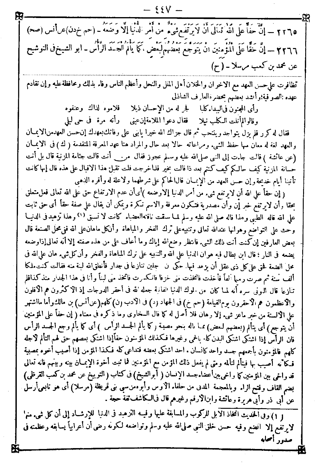 2265 - (إن حقا على الله أن لا يرتفع شيء من أمر الدنيا إلا وضعه) أي أن عدم الارتفاع حق على الله تعالى فعل متعلق بحقا وأن لا يرتفع خبر إن وأن مصدرية فتكون معرفة والاسم نكرة ويمكن أن يقال على صفة حقا أي حق ثابت على الله قاله الطيبي وهذا قاله صلى الله عليه وسلم لما سبقت ناقته العضباء كانت لا تسبق (1) وهذا تزهيد في الدنيا وحث على التواضع وهوانها عند الله تعالى وتنبيه على ترك الفخر والمباهاة وأن كل ما هان على الله ففي محل الصنعة قال بعض العارفين: إن كنت أنت ذلك الشيء فانتظر وضع الله إياك وما أخاف على من هذه صفته إلا أنه تعالى إذا وضعه يضعه في النار قال ابن بطال: فيه هوان الدنيا على الله والتنبيه على ترك المباهاة والفخر وأن كل شيء هان على الله في محل الضعة فحق على كل ذي عقل أن يزهد فيها. حكي أن رجلين تنازعا في جدار فأنطق الله لبنة منه فقالت كنت ملكا ألف سنة ثم صرت رميما ألفا فأخذت مني خزفا فانكسرت فاتخذت مني لبنا وأنا في هذا الجدار منذ كذا فلما تنازعا قال العوني: سره أنه لما كان من ملوك الدنيا الفانية جعله الله في أحقر الدرجات إذ الأكثرون هم الأقلون والأعظمون هم الأحقرون بوم القيامة
