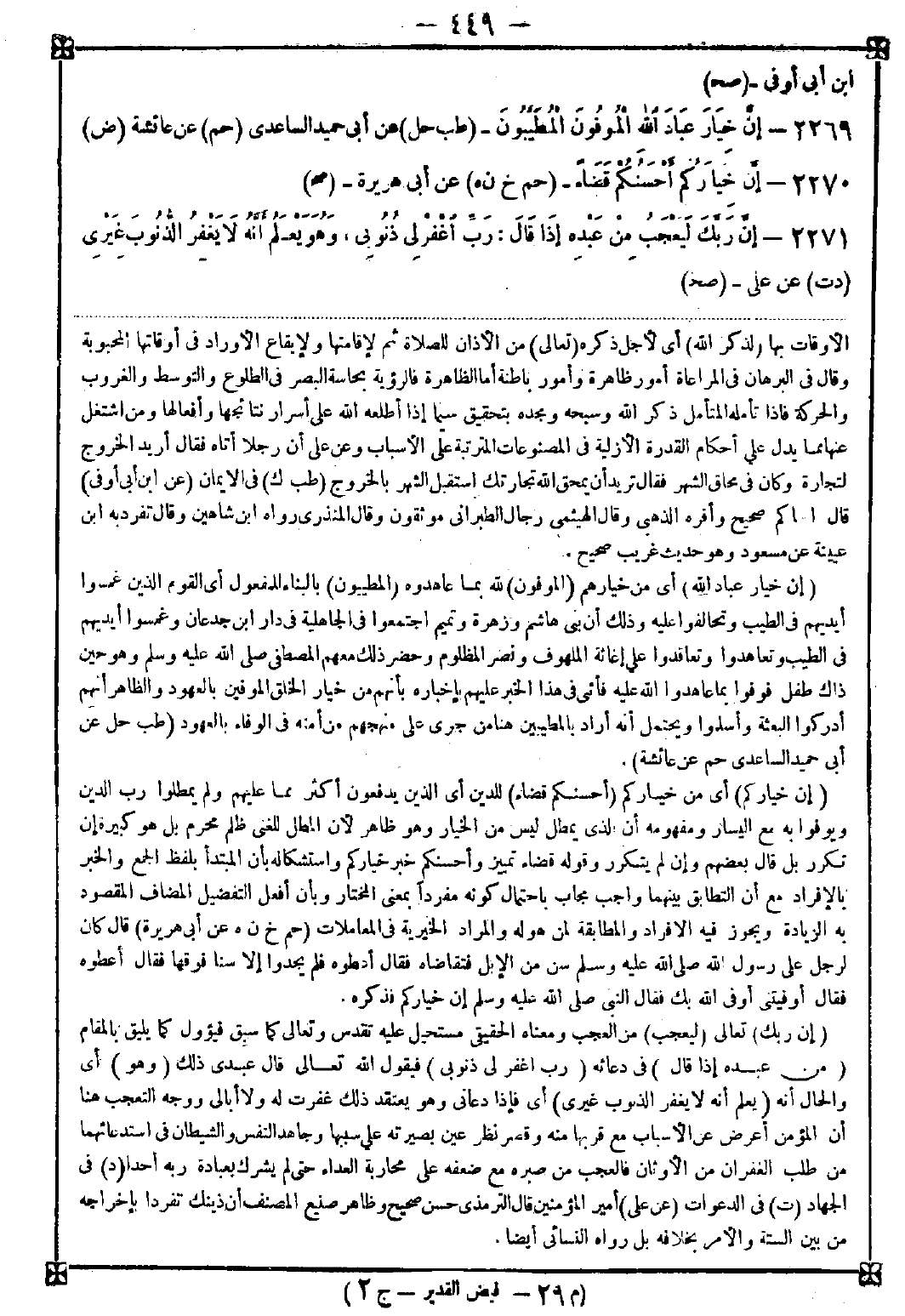 2270 - (إن خياركم) أي من خياركم (أحسنكم قضاء) للدين أي الذين يدفعون أكثر مما عليهم ولم يمطلوا رب الدين ويوفوا به مع اليسار ومفهومه أن الذي يمطل ليس من الخيار وهو ظاهر لأن المطل للغني ظلم محرم بل هو كبيرة إن تكرر بل قال بعضهم وإن لم يتكرر وقوله قضاء تمييز وأحسنكم خبر خياركم واستشكاله بأن المبتدأ بلفظ الجمع والخبر بالإفراد مع أن التطابق بينهما واجب مجاب باحتمال كونه مفردا بمعنى المختار وبأن أفعل التفضيل المضاف المقصود به الزيادة ويجوز فيه الإفراد والمطابقة لمن هو له والمراد الخيرية في المعاملات