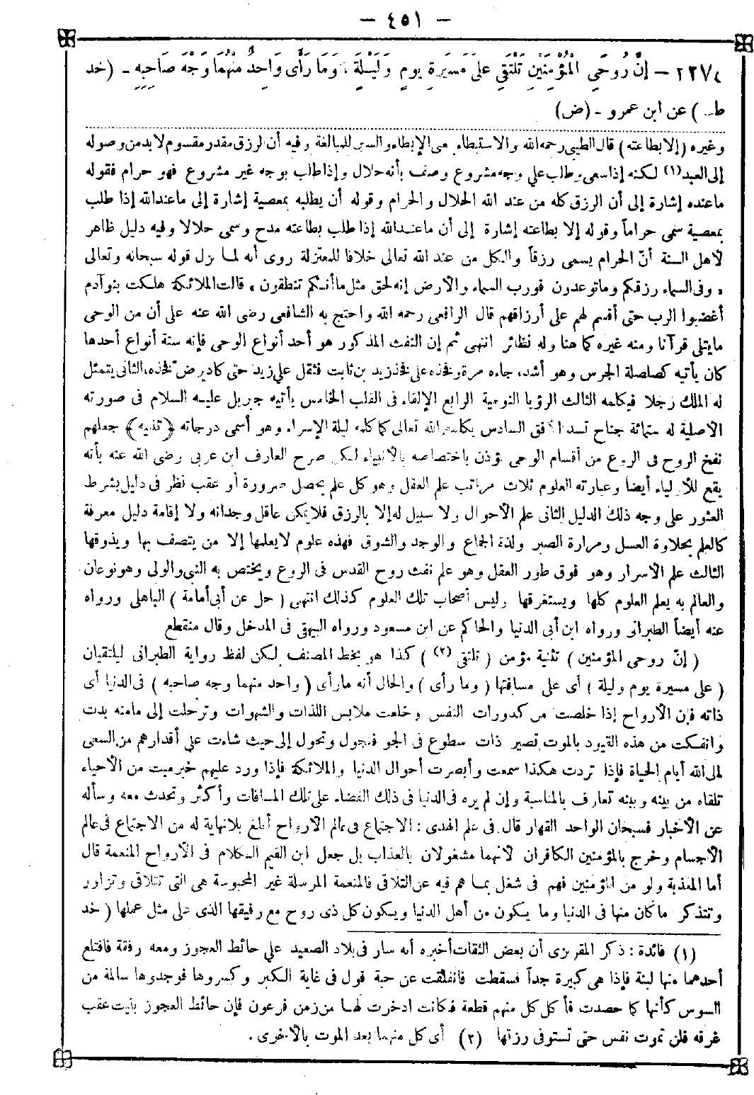 2274 - (إن روحي المؤمنين) تثنية مؤمن (تلتقي (1)) كذا هو بخط المصنف لكن لفظ رواية الطبراني ليلتقيان (على مسيرة يوم وليلة) أي على مسافتها (وما رأى) والحال أنه ما رأى (واحد منهما وجه صاحبه) في الدنيا أي ذاته فإن الأرواح إذا خلصت من كدورات النفس وخلعت ملابس اللذات والشهوات وترحلت إلى ما منه بدت وانفكت من هذه القيود بالموت تصير ذات سطوع في الجو فتجول وتحول إلى حيث شاءت على أقدارهم من السعي إلى الله أيام الحياة فإذا تردت هكذا سمعت وأبصرت أحوال الدنيا والملائكة فإذا ورد عليهم خبر ميت من الأحياء تلقاه من بينه وبينه تعارف بالمناسبة وإن لم يره في الدنيا في ذلك الفضاء على تلك المسافات وأكثر وتحدث معه وسأله عن الأخبار فسبحان الواحد القهار قال في علم الهدى: الاجتماع في عالم الأرواح أبلغ بلا نهاية له من الاجتماع في عالم الأجسام وخرج بالمؤمنين الكافران لأنهما مشغولان بالعذاب بل جعل ابن القيم الكلام في الأرواح المنعمة قال أما المعذبة ولو من المؤمنين فهم في شغل بما هم فيه عن التلافي فالمنعمة المرسلة غير المحبوسة هي التي تتلاقى وتزاور وتتذكر ما كان منها في الدنيا وما يكون من أهل الدنيا ويكون كل ذي روح مع رفيقها الذي على مثل عملها. -[452]-