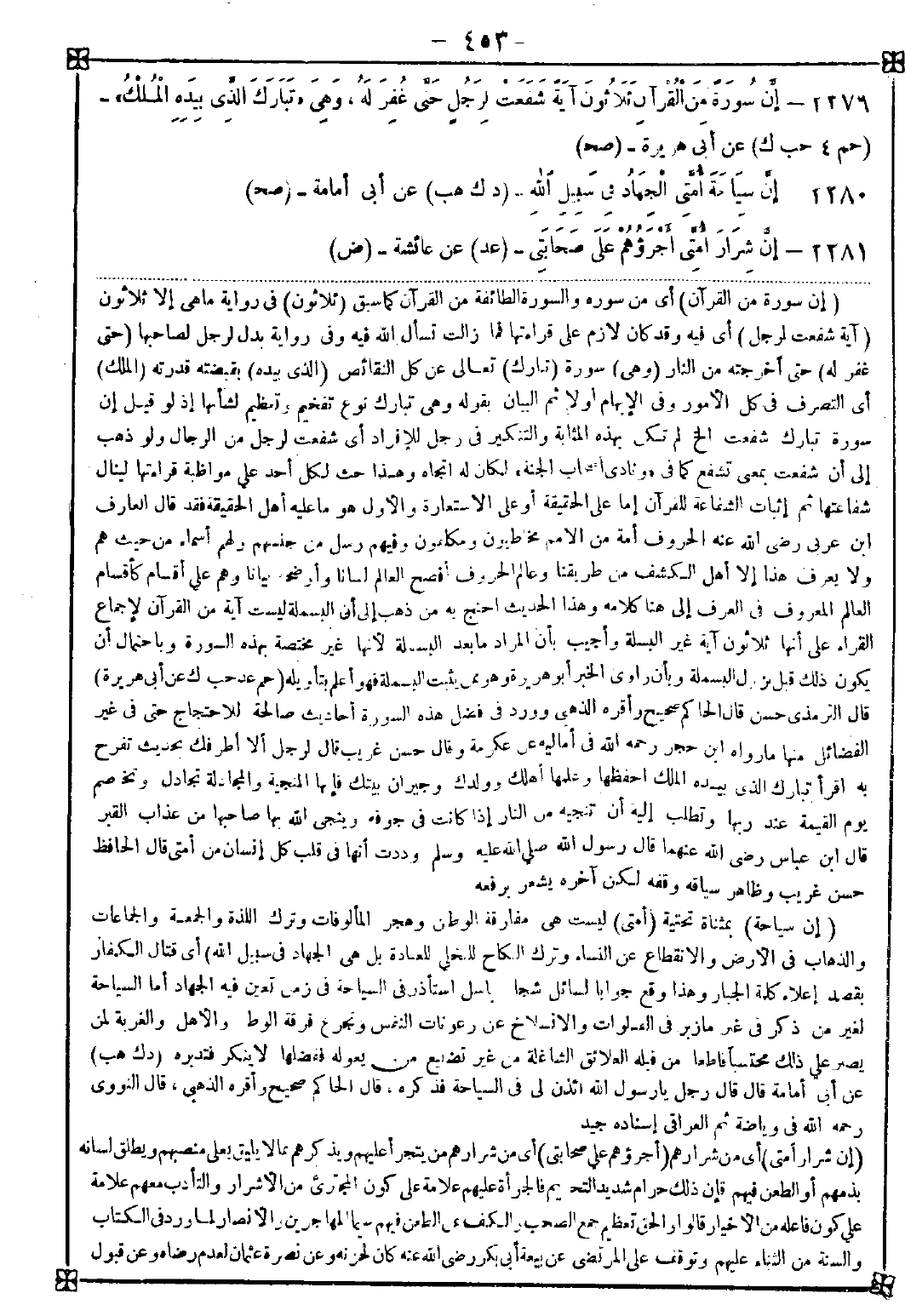 -[453]- 2279 - (إن سورة من القرآن) أي من سوره والسورة الطائفة من القرآن كما سبق (ثلاثون) في رواية ما هي إلا ثلاثون (آية شفعت لرجل) أي فيه وقد كان لازم على قراءتها فما زالت تسأل الله فيه وفي رواية بدل لرجل لصاحبها (حتى غفر له) حتى أخرجته من النار (وهي) سورة (تبارك) تعالى عن كل النقائص (الذي بيده) بقبضته قدرته (الملك) أي التصرف في كل الأمور وفي الإبهام أولا ثم البيان بقوله وهي تبارك نوع تفخيم وتعظيم لشأنها إذ لو قيل إن سورة تبارك شفعت إلخ لم تكن بهذه المثابة والتنكير في رجل للإفراد أي شفعت لرجل من الرجال ولو ذهب إلى أن شفعت بمعنى تشفع كما في {ونادى أصحاب الجنة} لكان له اتجاه وهذا حث لكل أحد على مواظبة قراءتها لينال شفاعتها ثم إثبات الشفاعة للقرآن إما على الحقيقة أو على الاستعارة والأول هو ما عليه أهل الحقيقة فقد قال العارف ابن عربي رضي الله عنه: الحروف أمة من الأمم مخاطبون ومكلمون وفيهم رسل من جنسهم ولهم أسماء من حيث هم ولا يعرف هذا إلا أهل الكشف من طريقنا وعالم الحروف أفصح العالم لسانا وأوضحه بيانا وهم على أقسام كأقسام العالم المعروف في العرف إلى هنا كلامه وهذا الحديث احتج به من ذهب إلى أن البسملة ليست آية من القرآن لإجماع القراء على أنها ثلاثون آية غير البسملة وأجيب بأن المراد ما بعد البسملة لأنها غير مختصة بهذه السورة وباحتمال أن يكون ذلك قبل نزول البسملة وبأن راوي الخبر أبو هريرة وهو ممن يثبت البسملة فهو أعلم بتأويله