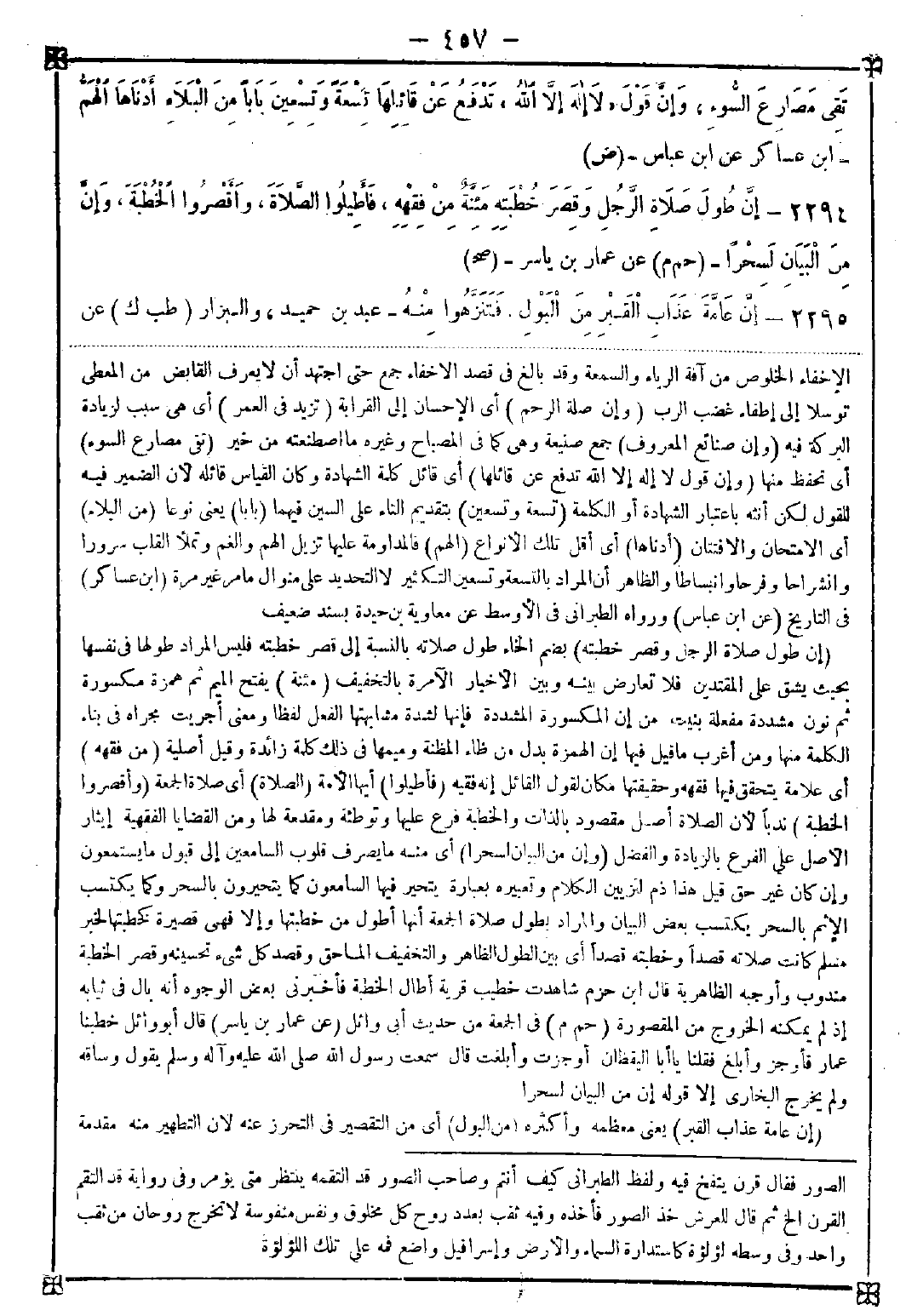2294 - (إن طول صلاة الرجل وقصر خطبته) بضم الخاء طول صلاته بالنسبة إلى قصر خطبته فليس المراد طولها في نفسها بحيث يشق على المقتدين فلا تعارض بينه وبين الأخبار الآمرة بالتخفيف (مئنة) بفتح الميم ثم همزة مكسورة ثم نون مشددة مفعلة بنيت من إن المكسورة المشددة فإنها لشدة مشابهتها الفعل لفظا ومعنى أجريت مجراه في بناء الكلمة منها ومن أغرب ما قيل فيها إن الهمزة بدل من ظاء المظنة وميمها في ذلك كلمة زائدة وقيل أصلية (من فقهه) أي علامة يتحقق فيها فقهه وحقيقتها مكان لقول القائل إنه فقيه (فأطيلوا) أيها الأمة (الصلاة) أي صلاة الجمعة (وأقصروا الخطبة) ندبا لأن الصلاة أصل مقصود بالذات والخطبة فرع عليها وتوطئة ومقدمة لها ومن القضايا الفقهية إيثار الأصل على الفرع بالزيادة والفضل (وإن من البيان لسحرا) أي منه ما يصرف قلوب السامعين إلى قبول ما يستمعون وإن كان غير حق هذا ذم لتزيين الكلام وتعبيره بعبارة يتحير فيها السامعون كما يتحيرون بالسحر وكما يكتسب الإثم بالسحر يكتسب بعض البيان والمراد بطول صلاة الجمعة أنها أطول من خطبتها وإلا فهي قصيرة كخطبتها لخبر مسلم كانت صلاته قصدا وخطبته قصدا أي بين الطول الظاهر والتخفيف الماحق وقصد كل شيء تحسينه وقصر الخطبة مندوب وأوجبه الظاهرية قال ابن حزم شاهدت خطيب قرية أطال الخطبة فأخبرني بعض الوجوه أنه بال في ثيابه إذ لم يمكنه الخروج من المقصورة. (1)