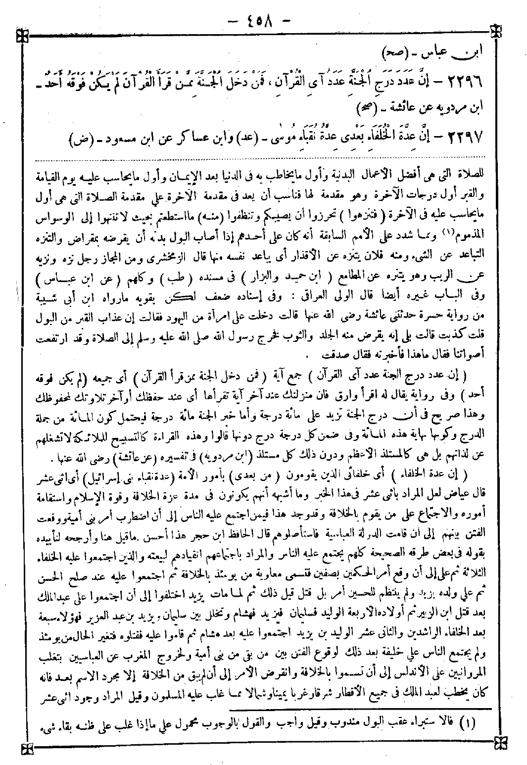 (1) وحمله الشيعة والإمامية على الإثني عشر إماما علي ثم ابنه الحسن ثم أخوه الحسين ثم ابنه زين العابدين ثم ابنه محمد الباقر ثم ابنه جعفر الصادق ثم ابنه موسى الكاظم ثم ابنه علي الرضى ثم ابنه محمد التقي ثم ابنه على النقي بالنون ثم ابنه حسن العسكري ثم ابنه محمد القائم المنتظر المهدي وأنه اختفى من أعدائه وسيظهر فيملأ الدنيا قسطا كما ملئت جورا وأنه عندهم لا امتناع من طول حياته كعيسى والخضر وهذا كلام متهافت ساقط