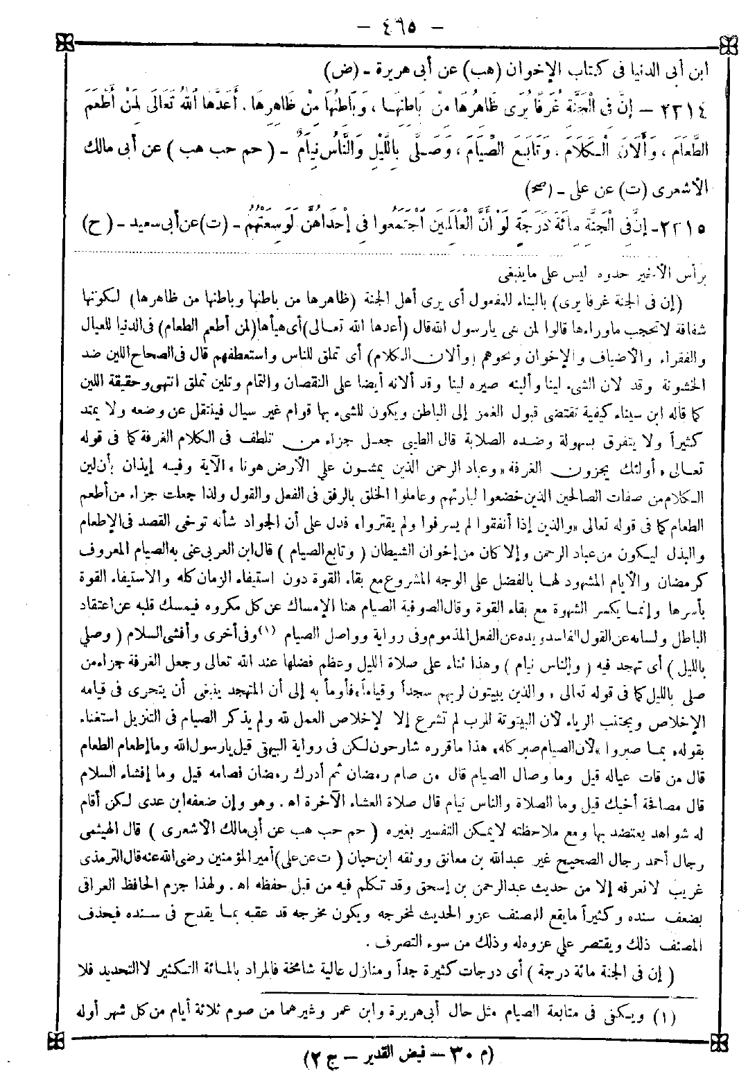 2314 - (إن في الجنة غرفا يرى) بالبناء للمفعول أي يرى أهل الجنة (ظاهرها من باطنها وباطنها من ظاهرها) لكونها شفافة لا تحجب ما وراءها قالوا لمن هي يا رسول الله قال (أعدها الله تعالى) أي هيأها (لمن أطعم الطعام) في الدنيا للعيال والفقراء والأضياف والإخوان ونحوهم (وألان الكلام) أي تملق للناس واستعطفهم قال في الصحاح اللين ضد الخشونة وقد لان الشيء لينا وألينه صيره لينا وقد ألانه أيضا على النقصان والتمام وتلين تملق انتهى وحقيقة اللين كما قاله ابن سيناء كيفية تقتضي قبول الغمز إلى الباطن ويكون للشيء بها قوام غير سيال فينتقل عن وضعه ولا يمتد كثيرا ولا يتفرق بسهولة وضده الصلابة قال الطيبي: جعل جزاء من تلطف في الكلام الغرفة كما في قوله تعالى {أولئك يجزون الغرفة} {وعباد الرحمن الذين يمشون على الأرض هونا} الآية. وفيه إيذان بأن لين الكلام من صفات الصالحين الذين خضعوا لبارئهم وعاملوا الخلق بالرفق في الفعل والقول ولذا جعلت جزاء من أطعم الطعام كما في قوله تعالى {والذين إذا أنفقوا لم يسرفوا ولم يقتروا} فدل على أن الجواد شأنه توخي القصد في الإطعام والبذل ليكون من عباد الرحمن وإلا كان من إخوان الشيطان (وتابع الصيام) قال ابن العربي: عنى به الصيام المعروف كرمضان والأيام المشهود لها بالفضل على الوجه المشروع مع بقاء القوة دون استيفاء الزمان كله والاستيفاء القوة بأسرها وإنما يكسر الشهوة مع بقاء القوة وقال الصوفية الصيام هنا الإمساك عن كل مكروه فيمسك قلبه عن اعتقاد الباطل ولسانه عن القول الفاسد ويده عن الفعل المذموم وفي رواية وواصل الصيام (1) وفي أخرى وأفشى السلام (وصلى بالليل) أي تهجد فيه (والناس نيام) وهذا ثناء على صلاة الليل وعظم فضلها عند الله تعالى وجعل الغرفة جزاء من صلى بالليل كما في قوله تعالى {والذين يبيتون لربهم سجدا وقياما} فأومأ به إلى أن المتهجد ينبغي أن يتحرى في قيامه الإخلاص ويجتنب الرياء لأن البيتوتة للرب لم تشرع إلا لإخلاص العمل لله ولم يذكر الصيام في التنزيل استغناء بقوله {بما صبروا} لأن الصيام صبر كله هذا ما قرره شارحون لكن في رواية البيهقي قيل يا رسول الله وما إطعام الطعام قال من قات عياله قيل وما وصال الصيام قال من صام رمضان ثم أدرك رمضان فصامه قيل وما إفشاء السلام قال مصافحة أخيك قيل وما الصلاة والناس نيام قال صلاة العشاء الآخرة اه. وهو وإن ضعفه ابن عدي لكن أقام له شواهد يعتضد بها ومع ملاحظته لا يمكن التفسير بغيره