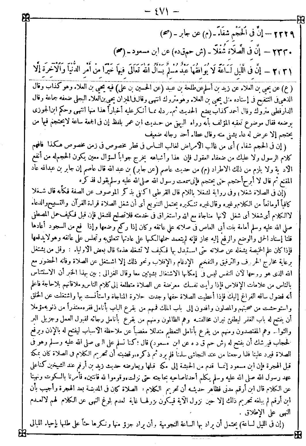 2331 - (إن في الليل لساعة) يحتمل أن يراد بها الساعة النجومية وأن يراد جزؤ منها ونكرها حثا على طلبها بإحياء الليالي -[472]- (لا يوافقها) أي يصادفها (عبد) في رواية رجل (مسلم يسأل الله تعالى فيها خيرا من أمر الدنيا والآخرة إلا أعطاه إياه وذلك كل ليلة) أي ذلك المذكور يحصل كل ليلة فلا يختص ببعض الليالي بل كائن في جميعها قبيل تلك الساعة في الثلث الأخير الذي يقول فيه الله من يدعوني فأستجيب له وقيل وقت السحر وقيل مطلقة وجزم الغزالي بأنها مبهمة في جميع الليالي كليلة القدر في رمضان وحكمة إبهامها توفر الدواعي على مراقبتها والإجتهاد في الدعاء في جميع ساعات الليل كما قالوه في إبهام حكمة ليلة القدر