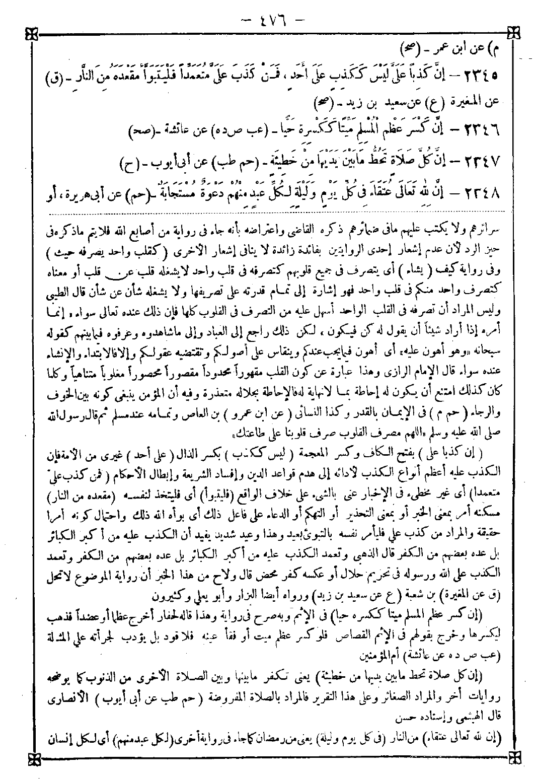 2345 - (إن كذبا علي) بفتح الكاف وكسر المعجمة (ليس ككذب) بكسر الذال (على أحد) غيري من الأمة فإن الكذب عليه أعظم أنواع الكذب لأدائه إلى هدم قواعد الدين وإفساد الشريعة وإبطال الأحكام (فمن كذب علي متعمدا) أي غير مخطىء في الإخبار عنى بالشيء على خلاف الواقع (فليتبوأ) أي فليتخذ لنفسه (مقعده من النار) مسكنه أمر بمعنى الخبر أو بمعنى التحذير أو التهكم أو الدعاء على فاعل ذلك أي بوأه الله ذلك واحتمال كونه أمرا حقيقة والمراد من كذب علي فليأمر نفسه بالتبوىء بعيد وهذا وعيد شديد يفيد أن الكذب عليه من أكبر الكبائر بل عده بعضهم من الكفر قال الذهبي: وتعمد الكذب عليه من أكبر الكبائر بل عده بعضهم من الكفر وتعمد الكذب على الله ورسوله في تحريم حلال أو عكسه كفر محض قال: ولاح من هذا الخبر أن رواية الموضوع لا تحل