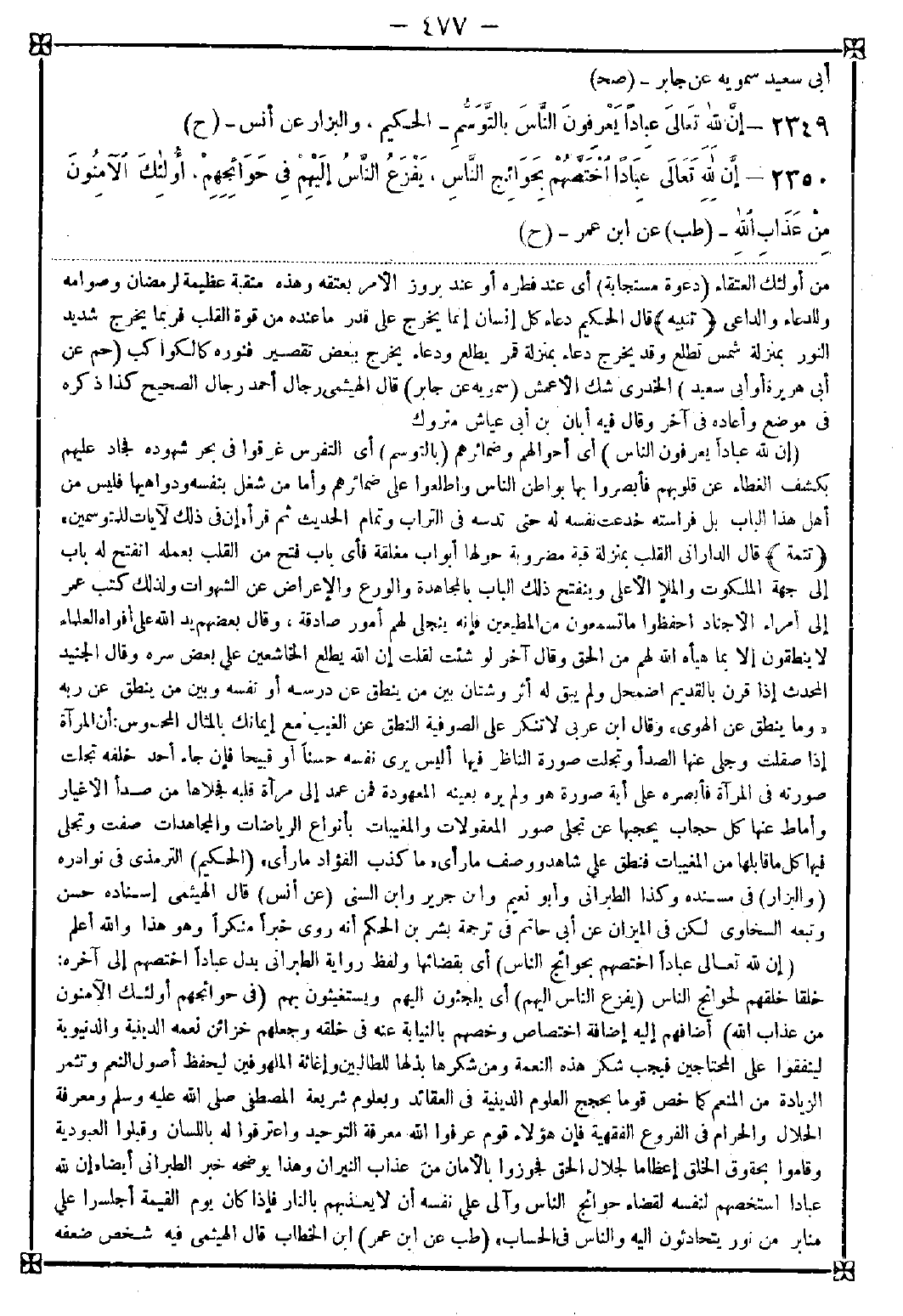 2350 - (إن لله تعالى عبادا اختصهم بحوائج الناس) أي بقضائها ولفظ رواية الطبراني بدل عبادا اختصهم إلى آخره: خلقا خلقهم لحوائج الناس (يفزع الناس إليهم) أي يلجئون إليهم ويستغيثون بهم (في حوائجهم أولئك الآمنون من عذاب الله) أضافهم إليه إضافة اختصاص وخصهم بالنيابة عنه في خلقه وجعلهم خزائن نعمه الدينية والدنيوية لينفقوا على المحتاجين فيجب شكر هذه النعمة ومن شكرها بذلها للطالبين وإغاثة الملهوفين ليحفظ أصول النعم وتثمر الزيادة من المنعم كما خص قوما بحجج العلوم الدينية في العقائد وبعلوم شريعة المصطفى صلى الله عليه وسلم ومعرفة الحلال والحرام في الفروع الفقهية فإن هؤلاء قوم عرفوا الله معرفة التوحيد واعترفوا له باللسان وقبلوا العبودية وقاموا بحقوق الخلق إعظاما لجلال الحق فجوزوا بالأمان من عذاب النيران وهذا يوضحه خبر الطبراني أيضا " إن لله عبادا استخصهم لنفسه لقضاء حوائج الناس وآلى على نفسه أن لا يعذبهم بالنار فإذا كان يوم القيامة أجلسوا على منابر من نور يتحادثون إليه والناس في الحساب "