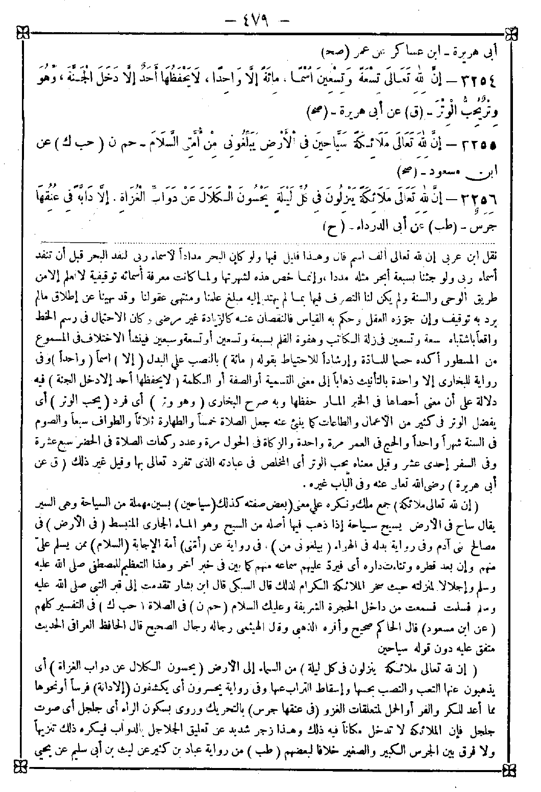 3256 - (إن لله تعالى ملائكة ينزلون في كل ليلة) من السماء إلى الأرض (يحسون الكلال عن دواب الغزاة) أي يذهبون عنها التعب والنصب بحسها وإسقاط التراب عنها وفي رواية يحسرون أي يكشفون (إلا دابة) فرسا أو نحوها مما أعد للكر والفر أو الحمل لمتعلقات الغزو (في عنقها جرس) بالتحريك وروي بسكون الراء أي جلجل أي صوت جلجل فإن الملائكة لا تدخل مكانا فيه ذلك وهذا زجر شديد عن تعليق الجلاجل بالدواب فيكره ذلك تنزيها ولا فرق بين الجرس الكبير والصغير خلافا لبعضهم