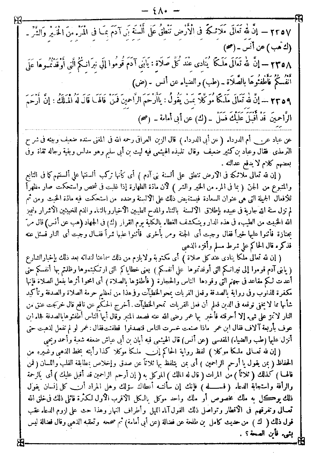 2359 - (إن لله تعالى ملكا موكلا) لفظ رواية الحاكم إن ملكا موكلا كذا رأيته بخط الذهبي وغيره من الحفاظ (بمن يقول يا أرحم الراحمين) أي بمن يتلفظ بها ثلاثا عن صدق وإخلاص بمطابقة القلب واللسان (فمن قالها) كذلك (ثلاثا) من المرات (قال له الملك) الموكل به (إن أرحم الراحمين قد أقبل عليك) أي بالرحمة والرأفة واستجابة الدعاء (فسله) فإنك إن سألته أعطاك سؤلك وهل المراد أن كل إنسان يقول ذلك يوكل به ملك مخصوص أو ملك واحد موكل بالكل الأقرب الأول لكثرة قائلي ذلك في خلق الله تعالى وتفرقهم في الأقطار وتواصل ذلك القول آناء الليل وأطراف النهار وهذا حث على لزوم الدعاء عقب قول ذلك
