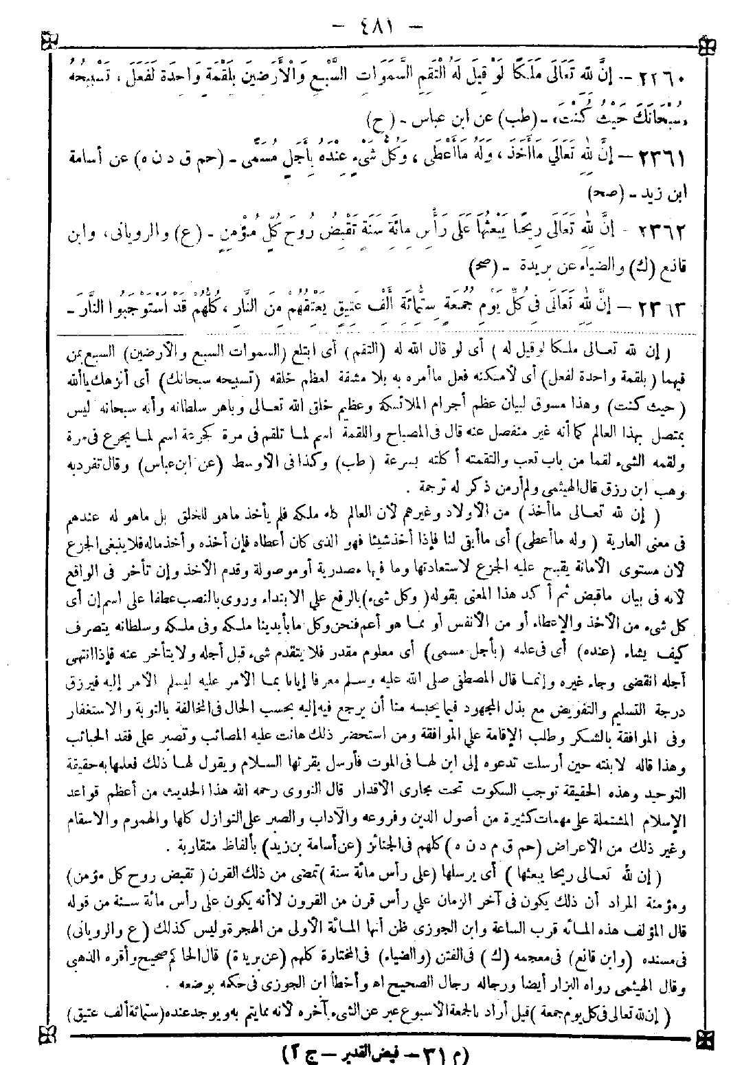 2363 - (إن لله تعالى في كل يوم جمعة) قيل أراد بالجمعة الأسبوع عبر عن الشيء بآخره لأنه مما يتم به ويوجد عنده (ست مئة ألف عتيق) -[482]- يحتمل من الآدميين ويحتمل من غيرهم أيضا كالجن (يعتقهم من النار) أي من دخول نار جهنم يوم القيامة (كلهم قد استوجبوا النار) أي دخولها بمقتضى الوعيد والظاهر أن المراد بالست مئة ألف التكثير وأنهم فوق ذلك بكثير ورحمته سبقت غضبه فإن فرض إرادة التحديد فجملة ذلك ثمانية عشر ألف ألف إن كان رمضان كاملا فإن كان ناقصا فيكون سبعة عشر ألف ألف وأربع مئة ألف