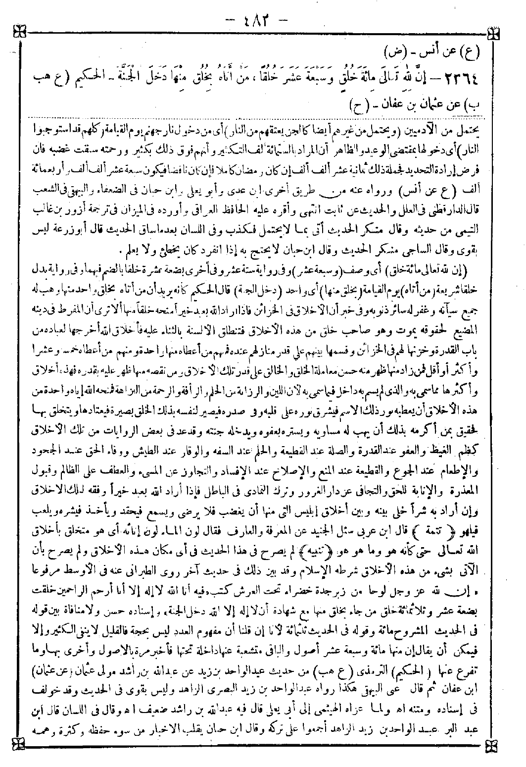 2364 - (إن لله تعالى مئة خلق) أي وصف (وسبعة عشر) وفي رواية ستة عشر وفي أخرى بضعة عشرة خلقا بالضم فيهما وفي رواية بدل خلقا شريعة (من أتاه) يوم القيامة (بخلق منها) أي واحد (دخل الجنة) قال الحكيم: كأنه يريد أن من أتاه بخلق واحد منها وهب له جميع سيئاته وغفر له سائر ذنوبه وفي خبر أن الأخلاق في الخزائن فإذا أراد الله بعبد خيرا منحه خلقا منها ألا ترى أن المفرط في دينه المضيع لحقوقه يموت وهو صاحب خلق من هذه الأخلاق فتنطلق الألسنة بالثناء عليه فأخلاق الله أخرجها لعباده من باب القدرة وخزنها لهم في الخزائن وقسمها بينهم على قدر منازلهم عنده فمنهم من أعطاه منها واحدة ومنهم من أعطاه خمسة وعشرا وأكثر أو أقل فمن زاد منها ظهر منه حسن معاملة الخلق والخالق هلى قدر تلك الأخلاق ومن نقصه منها ظهر عليه بقدره فهذه أخلاق وأكثرها مما سمي به والذي لم يسم به داخل فيما سمي به لأن اللين والرزانة من الحلم والرأفة والرحمة من النزاهة فمنحه الله إياه واحدة من هذه الأخلاق أن يعطيه نور ذلك الاسم فيشرق نوره على قلبه وفي صدره فيصير لنفسه بذلك الخلق بصيرة فيعتادها ويتخلق بها فحقيق بمن أكرمه بذلك أن يهب له مساويه ويستره بعفوه ويدخله جنته وقد عد في بعض الروايات من تلك الأخلاق كظم الغيظ والعفو عند القدرة والصلة عند القطيعة والحلم عند السفه والوقار عند الطيش ووفاء الحق عند الجحود والإطعام عند الجوع والقطيعة عند المنع والإصلاح عند الإفساد والتجاوز عن المسيء والعطف على الظالم وقبول المعذرة والإنابة للحق والتجافي عن دار الغرور وترك التمادي في الباطل فإذا أراد الله بعبد خيرا وفقه لتلك الأخلاق وإن أراد به شرا خلى بينه وبين أخلاق إبليس التي منها أن يغضب فلا يرضى ويسمع فيحقد ويأخذ في شره ويلعب فيلهو (تتمة) قال ابن عربي: سئل الجنيد عن المعرفة والعارف فقال لون الماء لون إنائه أي هو متخلق بأخلاق الله تعالى حتى كأنه هو وما هو هو. <تنبيه> لم يصرح في هذا الحديث في أي مكان هذه الأخلاق ولم يصرح بأن الآتي بشيء من هذه الأخلاق شرطه الإسلام وقد بين ذلك في حديث آخر روى الطبراني عنه في الأوسط مرفوعا " إن لله عز وجل لوحا من زبرجدة خضراء تحت العرش كتب فيه أنا الله لا إله إلا أنا أرحم الراحمين خلقت بضعة عشر وثلاث مئة خلق من جاء بخلق منها مع شهادة أن لا إله إلا الله دخل الجنة " وإسناده حسن ولا منافاة بين قوله في الحديث المشروح مئة وقوله في الحديث ثلثمئة لأنا إن قلنا أن مفهوم العدد ليس بحجة فالقليل لا ينفي الكثير وإلا فيمكن أن يقال إن منها مئة وسبعة عشر أصول والباقي متشعبة عنها داخلة تحتها فأخبر مرة بالأصول وأخرى بها وما تفرع عنها