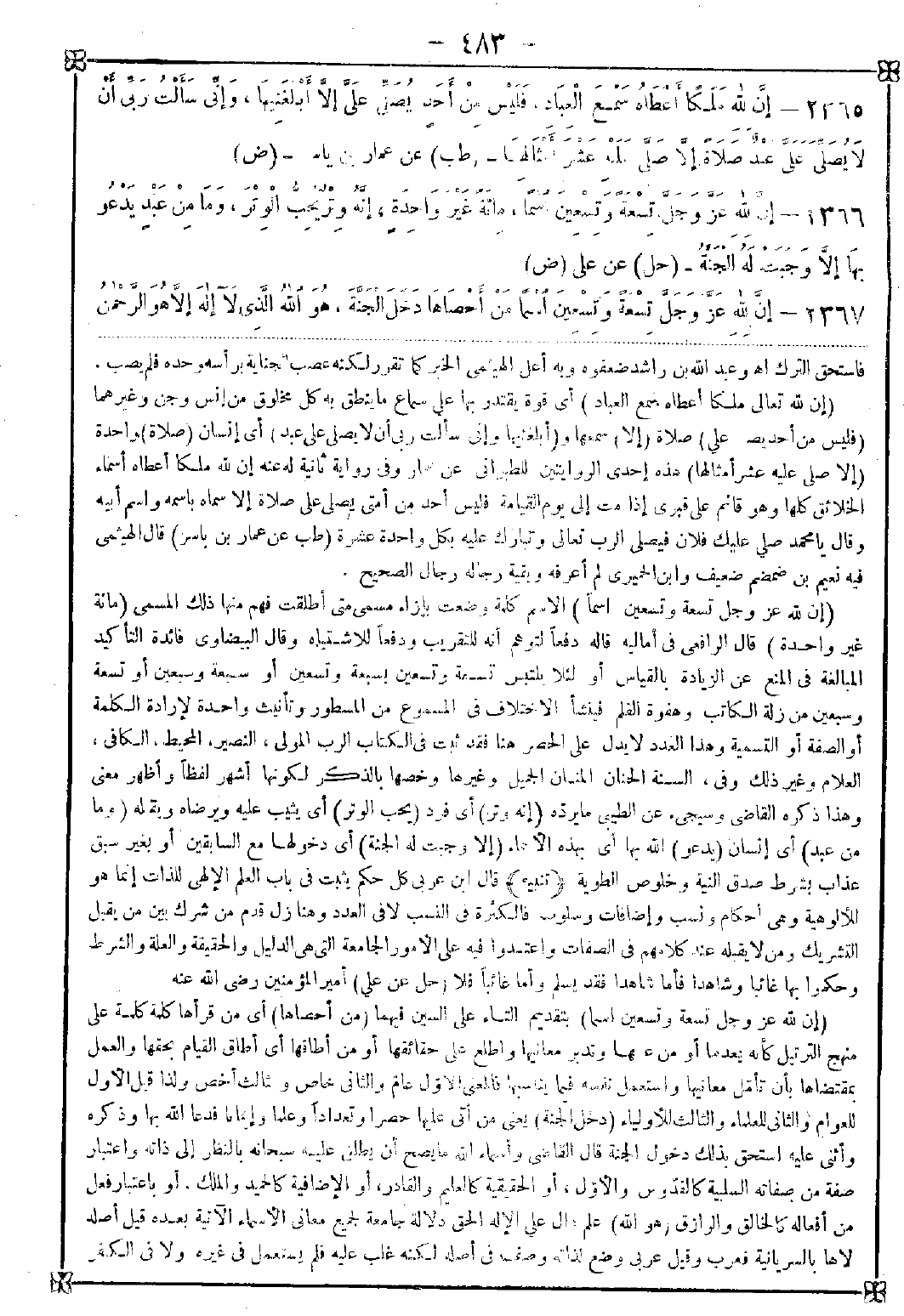 2366 - (إن لله عز وجل تسعة وتسعين اسما) الاسم كلمة وضعت بإزاء مسمى متى أطلقت فهم منها ذلك المسمى (مئة غير واحدة) قال الرافعي في أماليه: قاله دفعا لتوهم أنه للتقريب ودفعا للاشتباه وقال البيضاوي: فائدة التأكيد المبالغة في المنع عن الزيادة بالقياس أو لئلا يلتبس تسعة وتسعين بسبعة وتسعين أو سبعة وسبعين أو تسعة وسبعين من زلة الكاتب وهفوة القلم فينشأ الاختلاف في المسموع من المسطور وتأنيث واحدة لإرادة الكلمة أو الصفة أو التسمية وهذا العدد لا يدل على الحصر هنا فقد ثبت في الكتاب: الرب المولى النصير المحيط الكافي العلام وغير ذلك وفي السنة: الحنان المنان الجميل وغيرها وخصها بالذكر لكونها أشهر لفظا وأظهر معنى وهذا ذكره القاضي وسيجيء عن الطيبي ما يرده (إنه وتر) أي فرد (يحب الوتر) أي يثيب عليه ويرضاه ويقبله (وما من عبد) أي إنسان (يدعو) الله بها أي بهذه الأسماء (إلا وجبت له الجنة) أي دخولها مع السابقين أو بغير سبق عذاب بشرط صدق النية وخلوص الطوية (تتنبيه) قال ابن عربي: كل حكم يثبت في باب العلم الإلهي للذات إنما هو للألوهية وهي أحكام ونسب وإضافات وسلوب فالكثرة في النسب لا في العدد وهنا زل قدم من شرك بين من يقبل التشريك ومن لا يقبله عند كلامهم في الصفات واعتمدوا فيه على الأمور الجامعة التي هي الدليل والحقيقة والعلة والشرط وحكموا بها غائبا وشاهدا فأما شاهدا فقد يسلم وأما غائبا فلا