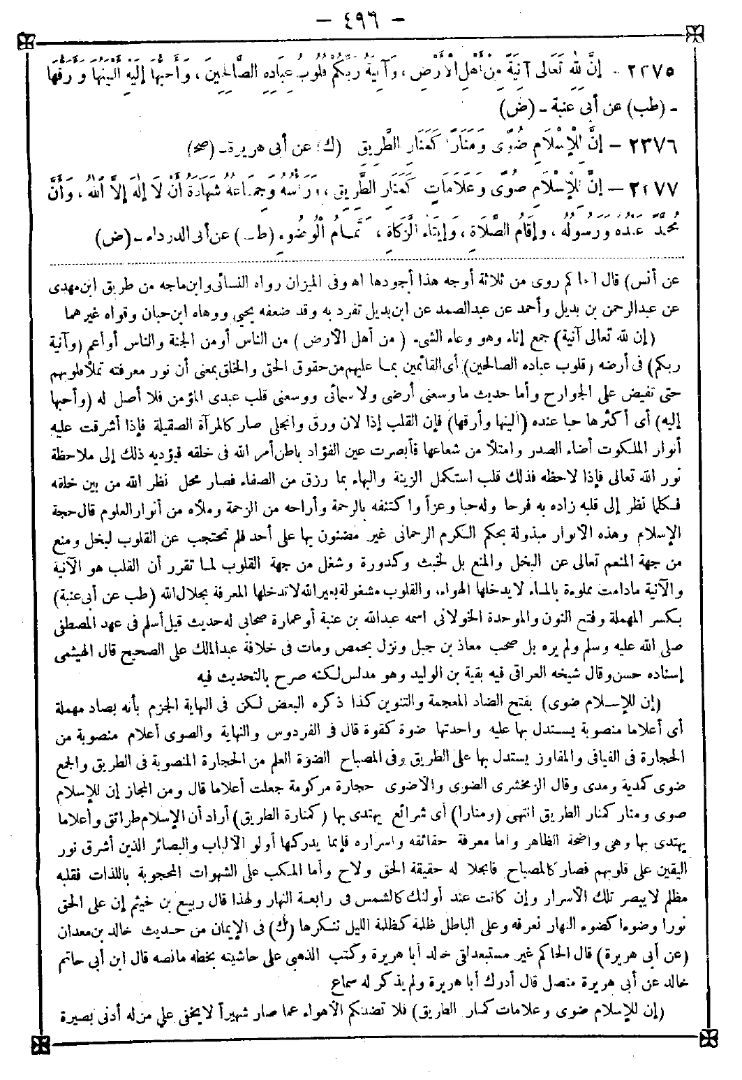 2376 - (إن للإسلام ضوى) بفتح الضاد العجمة والتنوين كذا ذكره البعض لكن في النهاية الجزم بأنه بصاد مهملة أي أعلاما منصوبة يستدل بها عليه واحدتها ضوة كقوة قال في الفردوس والنهاية: والصوى أعلام منصوبة من الحجارة في الفيافي والمفاوز يستدل بها على الطريق وفي المصباح: الضوة العلم من الحجارة المنصوبة في الطريق والجمع ضوى كمدية ومدى وقال الزمخشري: الضوى والأضوى حجارة مركومة جعلت أعلاما قال ومن المجاز إن للإسلام صوى ومنار كمنار الطريق انتهى (ومنارا) أي شرائع يهتدى بها (كمنارة الطريق) أراد أن الإسلام طرائق وأعلاما يهتدى بها وهي واضحة الظاهر وأما معرفة حقائقه وأسراره فإنما يدركها أولو الألباب والبصائر الذين أشرق نور اليقين على قلوبهم فصار كالمصباح فانجلا له حقيقة الحق ولاح وأما المكب على الشهوات المحجوبة باللذات فقلبه مظلم لا يبصر تلك الأسرار وإن كانت عند أولئك كالشمس في رابعة النهار ولهذا قال ربيع بن خيثم: إن على الحق نورا وضوءا كضوء النهار نعرفه وعلى الباطل ظلمة كظلمة الليل ننكرها