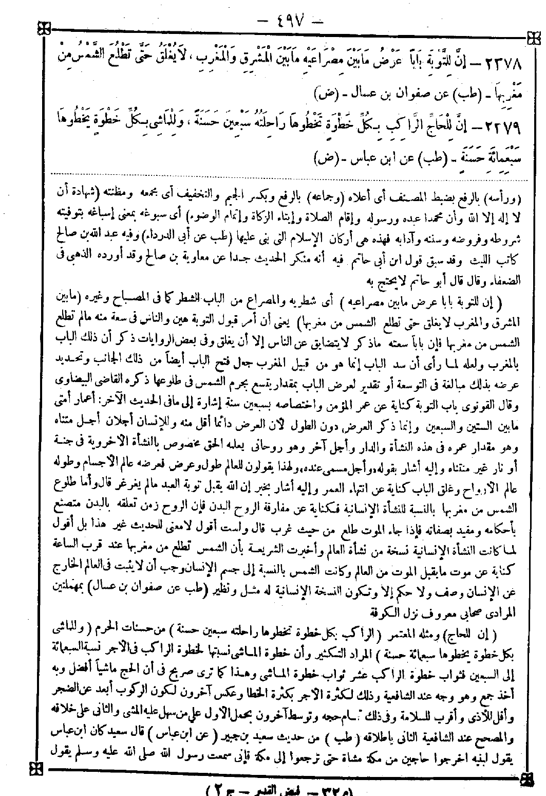 2378 - (إن للتوبة بابا عرض ما بين مصراعيه) أي شطريه والمصراع من الباب الشطر كما في المصباح وغيره (ما بين المشرق والمغرب لا يغلق حتى تطلع الشمس من مغربها) يعني أن أمر قبول التوبة هين والناس في سعة منه ما لم تطلع الشمس من مغربها فإن بابا سعته ما ذكر لا يتضايق عن الناس إلا أن يغلق وفي بعض الروايات ذكر أن ذلك الباب بالمغرب ولعله لما رأى أن سد الباب إنما هو من قبيل المغرب جعل فتح الباب أيضا من ذلك الجانب وتحديد عرضه بذلك مبالغة في التوسعة أو تقدير لعرض الباب بمقدار يتسع بجرم الشمس في طلوعها ذكره القاضي البيضاوي. وقال القونوي: باب التوبة كناية عن عمر المؤمن واختصاصه بسبعين سنة إشارة إلى ما في الحديث الآخر: أعمار أمتي ما بين الستين والسبعين وإنما ذكر العرض دون الطول لأن العرض دائما أقل منه وللإنسان أجلان أجل متناه وهو مقدار عمره في هذه النشأة والدار وأجل آخر وهو روحاني يعلمه الحق مخصوص بالنشأة الأخروية في جنة أو نار غير متناه وإليه أشار بقوله {وأجل مسمى عنده} ولهذا يقولون للعالم طول وعرض فعرضه عالم الأجسام وطوله عالم الأرواح وغلق الباب كناية عن انتهاء العمر وإليه أشار بخبر إن الله يقبل توبة العبد ما لم يغرغر قال: وأما طلوع الشمس من مغربها بالنسبة للنشأة الإنسانية فكناية عن مفارقة الروح البدن فإن الروح زمن تعلقه بالبدن متصنع بأحكامه ومقيد بصفاته فإذا جاء الموت طلع من حيث غرب قال: ولست أقول لا معنى للحديث غير هذا بل أقول لما كانت النشأة الإنسانية نسخة من نشأة العالم وأخبرت الشريعة بأن الشمس تطلع من مغربها عند قرب الساعة كناية عن موت ما يقبل الموت من العالم وكانت الشمس بالنسبة إلى جسم الإنسان وجب أن لا يئبت في العالم الخارج عن الإنسان وصف ولا حكم إلا وتكون النسخة الإنسانية له مثل ونظير