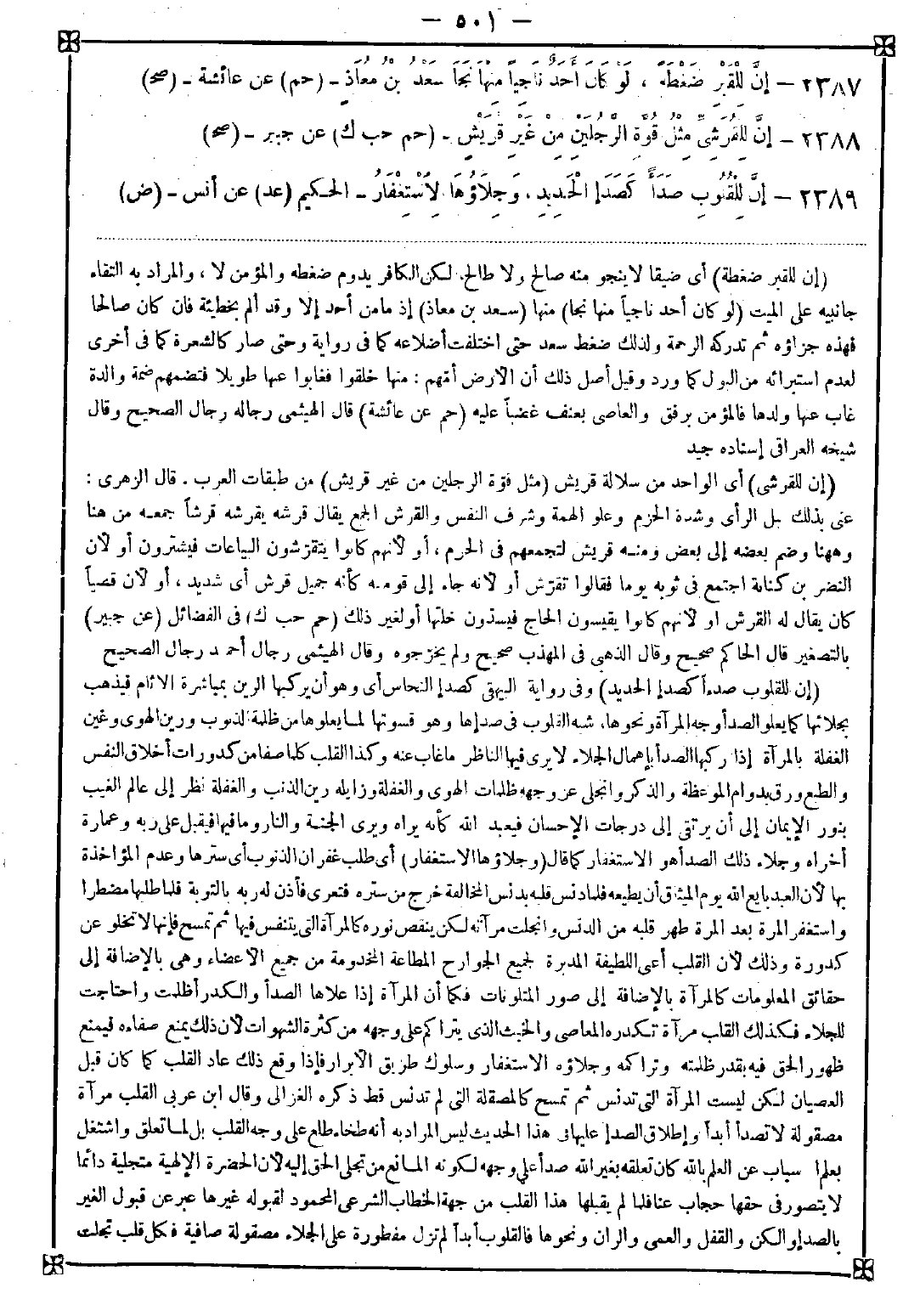 2389 - (إن للقلوب صدءا كصدأ الحديد) وفي رواية البيهقي كصدأ النحاس أي وهو أن يركبها الرين بمباشرة الآثام فيذهب بجلائها كما يعلوا الصدأ وجه المرآة ونحوها شبه القلوب في صدأها وهو قسوتها لما يعلوها من ظلمة الذنوب ورين الهوى وغين الغفلة بالمرآاة إذا ركبها الصدأ بإهمال الجلاء لا يرى فيها الناظر ما غاب عنه وكذا القلب كلما صفا من كدورات أخلاق النفس والطبع ورق بدوام الموعظة والذكر وانجلى عن وجهه ظلمات الهوى والغفلة وزايله رين الذنب والغفلة نظر إلى عالم الغيب بنور الإيمان إلى أن يرتقي إلى درجات الإحسان فيعبد الله كأنه يراه ويرى الجنة والنار وما فيها فيقبل على ربه وعمارة آخراه وجلاء ذلك الصدأ هو الاستغفار كما قال (وجلاؤها الاستغفار) أي طلب غفران الذنوب أي سترها وعدم المؤاخذة بها لأن العبد بايع الله يوم الميثاق أن يطيعه فلما دنس قلبه بدنس المخالفة خرج من ستره فتعرى فأذن له ربه بالتوبة فلما طلبها مضطرا واستغفر المرة بعد المرة طهر قلبه من الدنس وانجلت مرآته لكن ينقص نوره كالمرآة التي يتنفس فيها ثم تمسح فإنها لا تخلو عن كدورة وذلك لأن القلب أعني اللطيفة المدبرة لجميع الجوارح المطاعة المخدومة من جميع الأعضاء وهي بالإضافة إلى حقائق المعلومات كالمرآة بالإضافة إلى المتلونات فكما أن المرآة إذا علاها الصدأ والكدر أظلمت واحتاجت للجلاء فكذلك القلب مرآة تكدره المعاصي والخبث الذي يتراكم على وجهه من كثرة الشهوات لأن ذلك يمنع صفاءه فيمنع ظهور الحق فيه بقدر ظلمته وتراكمه وجلاؤه الاستغفار وسلوك طريق الأبرار فإذا وقع ذلك عاد القلب كما كان قبل العصيان لكن ليست المرآة التي تدنس ثم تمسح كالمصقلة التي لم تدنس قط ذكره الغزالي وقال ابن عربي: القلب مرآة مصقولة لا تصدأ ابدا وإطلاق الصدأ عليها في هذا الحديث ليس المراد به أنه طخاء طلع على وجه القلب بل لما تعلق واشتغل بعلم الأسباب عن العلم بالله كان تعلقه بغير الله صدأ على وجهه لكونه المانع من تجلي الحق إليه لأن الحضرة الإلهية متجلية دائما لا يتصور في حقها حجاب عنا فلما لم يقبلها هذا القلب من جهة الخطاب الشرعي المحمود لقبوله غيرها عبر عن قبول الغير بالصدأ والكن والقفل والعمى والران ونحوها فالقلوب أبدا لم تزل مفطورة على الجلاء مصقولة صافية فكل قلب تجلت -[502]- فيه الحضرة الإلهية من حيث هو ياقوت أحمر الذي هو التجلي الذاتي فذلك قلبه المشاهد الكامل الذي لا أحد فوقه في تجل من التجليات ودونه تجلي الصفات ودونهما تجلي الأفعال من حيث كونها من الحضرة الإلهية ومن لم يتجل له منها القلب الغافل عن الله المطرود عن قربه انتهى قال الراغب: والاستغفار استفعال من الغفران وأصله من العفو وهو إلباس الشيء ما يصونه عن الدنس ومنه قيل اغفر ثوبك في الوعاء فإنه أغفر للوسخ والغفران والمغفرة من الله تعالى أن يصون العبد عن أن يمسه ألم العذاب
