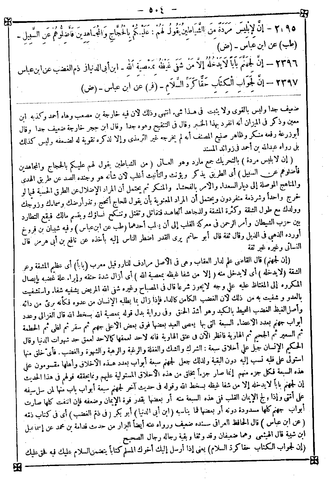 2395 - (إن لإبليس مردة) بالتحريك جمع مارد وهو العاتي (من الشياطين يقول لهم عليكم بالحجاج والمجاهدين فأضلوهم عن السبيل) أي الطريق يذكر ويؤنث والتأنيث أغلب لأن شأنه هو وجنده الصد عن طريق الهدى والمناهج الموصلة إلى ديار السعداء والأمر بالفحشاء والمنكر ثم يحتمل أن المراد الإضلال عن الطرق الحسية فيما لو خرج واحدا وشرذمة منفردون ويحتمل أن المراد المعنوية بأن يقول للحاج أتحج وتذر أرضك وسماءك وزوجك وولدك مع طول الشقة وكثرة المشقة وللمجاهد أتجاهد فتقاتل وتقتل وتنكح نساؤك ويقسم مالك فيقع التطارد بين حزب الشيطان وأمر الرحمن في معركة القلب إلى أن يغلب أحدهما