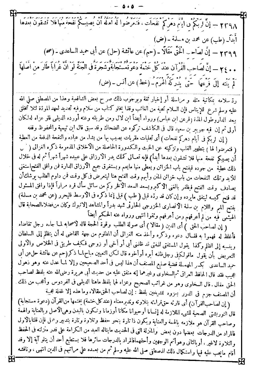 2398 - (إن لربكم في أيام دهركم نفحات) أي تجليات مقربات يصيب بها من يشاء من عباده والنفحة الدفعة من العطية (فتعرضوا لها) بتطهير القلب وتزكيته عن الخبث والكدورة الحاصلة من الأخلاق المذمومة ذكره الغزالي (لعل) أن يصيبكم نفحة منها فلا تشقون بعدها أبدا) فإنه تعالى كملك يدر الأرزاق على عبيده شهرا شهرا ثم له في خلال ذلك عطية من جوده فينفتح باب الخزائن ويعطى منها ما يعم ويستغرق جميع الأرزاق الدارة فمن وافق الفتح استغنى للأبد وتلك النفحات من باب خزائن المتن وأبهم وقت الفتح هنا ليتعرض في كل وقت فمن داوم الطلب يوشك أن يصادف وقت الفتح فيظفر بالغنى الأكبر ويسعد السعد الأفخر وكم من سائل سأل فرد مرارا فإذا وافق المسؤول قد فتح كيسه لينفق ما يرده وإن كان قد رده قبل