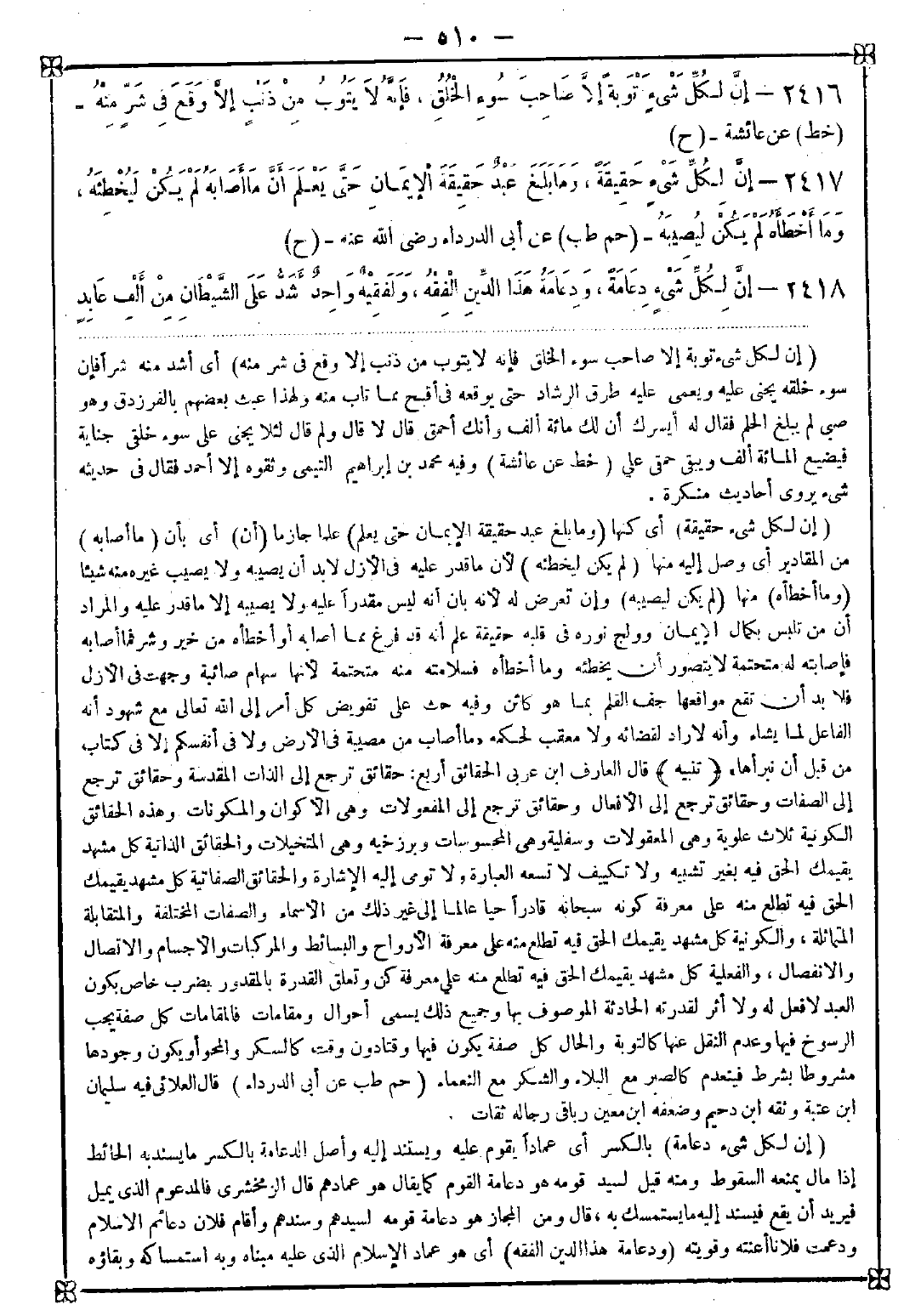 2417 - (إن لكل شيء حقيقة) أي كنها (وما بلغ عبد حقيقة الإيمان حتى يعلم) علما جازما (أن) أي بأن (ما أصابه) من المقادير أي وصل إليه منها (لم يكن ليخطئه) لأن ما قدر عليه في الأزل لا بد أن يصيبه ولا يصيب غيره منه شيئا (وما أخطأه) منها (لم يكن ليصيبه) وإن تعرض له لأنه بان أنه ليس مقدرا عليه ولا يصيبه إلا ما قدر عليه والمراد أن من تلبس بكمال الإيمان وولج نوره في قلبه حقيقة علم أنه قد فرغ مما أصابه أو أخطأه من خير وشر فما أصابه فإصابته له متحتمة لا يتصور أن يخطئه وما أخطأه فسلامته منه متحتمة لأنها سهام صائبة وجهت في الأزل فلا بد أن تقع مواقعها جف القلم بما هو كائن وفيه حث على تفويض كل أمر إلى الله تعالى مع شهود أنه الفاعل لما يشاء وأنه لا راد لقضائه ولا معقب لحكمه {ما أصاب من مصيبة في الأرض ولا في أنفسكم إلا في كتاب من قبل أن نبرأها} <تنبيه> قال العارف ابن عربي: الحقائق أربع: حقائق ترجع إلى الذات المقدسة وحقائق ترجع إلى الصفات وحقائق ترجع إلى الأفعال وحقائق ترجع إلى المفعولات وهي الأكوان والمكونات وهذه الحقائق الكونية ثلاث علوية وهي المعقولات وسفلية وهي المحسوسات وبرزخية وهي المتخيلات والحقائق الذاتية كل مشهد يقيمك الحق فيه بغير تشبيه ولا تكييف لا تسعه العبارة ولا تومي إليه الإشارة والحقائق الصفاتية كل مشهد يقيمك الحق فيه تطلع منه على معرفة كونه سبحانه قادرا حيا عالما إلى غير ذلك من الأسماء والصفات المختلفة والمتقابلة المتماثلة والكونية كل مشهد يقيمك الحق فيه تطلع منه على معرفة الأرواح والبسائط والمركبات والأجسام والاتصال والانفصال والفعلية كل مشهد يقيمك الحق فيه تطلع منه على معرفة كن وتعلق القدرة بالمقدور بضرب خاص بكون العبد لا فعل له ولا أثر لقدرته الحادثة الموصوف بها وجميع ذلك يسمى أحوال ومقامات فالمقامات كل صفة يجب الرسوخ فيها وعدم النقل عنها كالتوبة والحال كل صفة يكون فيها وقتادون وقت كالسكر والمحو أو يكون وجودها مشروطا بشرط فينعدم كالصبر مع البلاء والشكر مع النعماء
