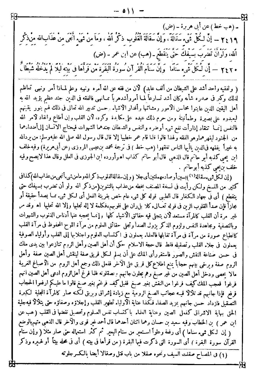 2419 - (إن لكل شيء سقالة (1)) بسين أو صاد مهملتين أي جلا (وإن سقالة القلوب ذكر الله وما من شيء أنجى من عذاب الله) كذا في كثير من النسخ ولكن رأيت في نسخة المصنف بخطه من عذاب بالتنوين (من ذكر الله ولو أن تضرب بسيفك حتى ينقطع) أي في جهاد الكفار. قال الطيبي: قوله كل شيء عام خص بقرينة الفعل أي لكل شيء مما يصدأ حقيقة أو مجازا فإن صدأ القلوب الرين في قوله تعالى {كلا بل ران على قلوبهم} فكلمة لا إله تجليها وإلا الله تحليها اه وقد مر غير مرة أن القلب كالمرآة مستعد لأن يتجلى فيه حقائق الأشياء كلها وإنما يحجبه عنها أدناس الذنوب والشهوات وبالتصفية ومجاهدة النفس ولزوم الذكر يزول الصدأ وتجلى حقائق العلوم من مرآة اللوح المحفوظ في مرآة القلب كانطباع صورة من مرآة في مرآة تقابلها فالعلماء يعملون في اكتساب العلوم واجتلابها إلى القلب وأولياء الصوفية يعملون في جلاء القلب وتصقيله فقط. قال حجة الإسلام: حكي أن أهل الصين وأهل الروم تنازعوا بين يدي ملك في حسن صناعة النقش والصور فاستقر رأي الملك على أن يسلم لكل فريق صفة لينقش أهل الصين صفة وأهل الروم صفة ويرخى بينهم حجابا يمنع اطلاع كل فريق على الآخر ففعل ذلك وجمع أهل الروم من الأصباغ الغربية مالا يحصى ودخل أهل الصين من غير صبغ وهم يجلون جانبهم ويصقلونه فلما فرغ أهل الروم ادعى أهل الصين أنهم فرغوا فعجب الملك كيف فرغوا من النقش بغير صبغ فقيل كيف فرغتم بغير صبغ قالوا ما عليكم ارفعوا الحجاب فرفع فإذا جانبهم قد تلألأ فيه عجائب الصنع الرومية مع زيادة إشراق وبريق لكنه صار كالمرآة المجلية لكثرة التصقيل فازداد حسن جانبهم بمزيد الصفاء فكذا عناية الأولياء تطهير القلوب وإجلاؤه وصفاؤه حتى يتلألأ فيه جلية الحق بنهاية الإشراق كفعل الصين وعناية العلماء باكتساب نفس العلوم وتحصيل نقضها في القلب
