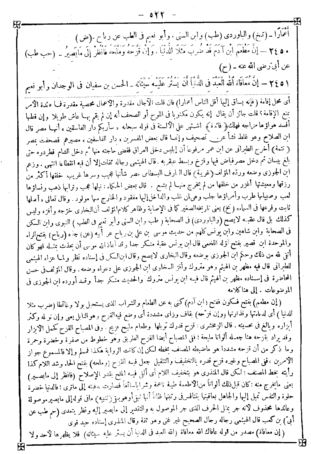 2450 - (إن مطعم) بفتح فسكون ففتح (ابن آدم) كنى به عن الطعام والشراب الذي يستحيل بولا وغائطا (ضرب مثلا الدنيا) أي لدناءتها وقذارتها (وإن قزحه) بقاف وزاي مشددة أي وضع فيه القزح وهو النابل يعني وإن نوبله وكثر أبزاره وبالغ في تحسينه. قال الزمخشري: قزح قدرك توبلها وطعام مليح مزيح. وفي المصباح القزح كحمل الأبزار وقد يراد بقزحه هنا جعله ألوانا مليحة ففي المصباح أيضا القزح الطريق وهو خطوط من صفرة وخضرة وحمرة وما ذكر من أن قزحه مشددا هو ما ضبطه المصنف بخطه لكن إن كانت الرواية هكذا فمسلم وإلا فالمسموع جواز الأمرين ففي المصباح وغيره قزح قدره بالتخفيف والتثقيل جعل فيه القزح (وملحه) بفتح الحاء وشد اللام كذا رأيته بخط المصنف لكن قال المنذري هو بتخفيف اللام أي ألقى فيه الملح بقدر الإصلاح (فانظر إلى ما يصير) يعني ما يخرج منه: كان قبل ذلك ألوانا من الأطعمة طيبة ناعمة وشرابا سائغا فصارت عاقبته إلى ما ترى فالدنيا خضرة حلوة والنفس تميل إليها والجاهل بعاقبتها يتنافس في رتبتها ظانا أنها تبقى أو هو يبقى. <تنبيه> ما في قوله إلى ما يصير موصولة وعائدها محذوف لأنه جر بمثل الحرف الذي جر الموصول به والتقدير إلى ما يصير إليه ونظر يتعدى