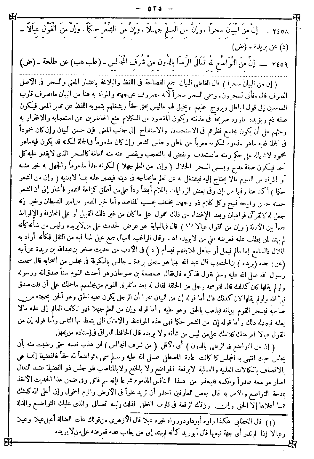 -[525]- 2458 - (إن من البيان سحرا) قال القاضي: البيان جمع الفصاحة في اللفظ والبلاغة باعتبار المعنى والسحر في الأصل الصرف قال {فأنى تسحرون} وسمي السحر سحرا لأنه مصروف عن جهته والمراد به هنا من البيان ما يصرف قلوب السامعين إلى قول الباطل ويروج عليهم ويخيل لهم ما ليس بحق حقا ويشغلهم بتمويه اللفظ عن تدبر المعنى فيكون صفة ذم ويؤيده ما ورد صريحا في مذمته ويكون المقصود من الكلام منع الحاضرين عن استعجابه والاغترار به وحثهم على أن يكون مجامع نظرهم في الاستحسان والاستقباح إلى جانب المعنى فإن حسن البيان وإن كان محمودا في الجملة ففيه ما هو مذموم لكونه معربا عن باطل وجنس الشعر وإن كان مذموما في الجملة لكنه قد يكون فيه ما هو محمود لاشتماله على حكم ومنه ما يستعذب ويقضى له بالتعجب ويقصر عنه منه العامة كالسحر الذي لا يقدر عليه كل أحد فيكون صفة مدح ويسمى السحر الحلال (وإن من العلم جهلا) لكونه علما مذموما والجهل به خير منه أو المراد من العلوم ما لا يحتاج إليه فيشتغل به عن تعلم ما يحتاجه في دينه فيصير علمه مما لا يعنيه (وإن من الشعر حكما) أكد هنا وفيما مر بأن في بعض الروايات باللام أيضا ردا على من أطلق كراهة الشعر فأشار إلى أن الشعر حسنه حسن وقبيحه قبيح وكل كلام ذو وجهين يختلف بحسب المقاصد وأما خبر الشعر مزامير الشيطان وخبر إنه جعل له كالقرآن فواهيان وبعد الإغضاء عن ذلك محمول على ما كان من غير ذلك القبيل أو على المجازفة والإفراط جمعا بين الأدلة (وإن من القول عيالا (1)) قال في النهاية: هو عرض الحديث على من لا يريده وليس من شأنه كأنه لم يهتد لمن يطلب علمه فعرضه على من لا يريده اه. وقال الراغب: العيال جمع عيل لما فيه من الثقل فكأنه أراد به الملال فالسامع إما عالم فيمل أو جاهل فلا يفهم فيسأم