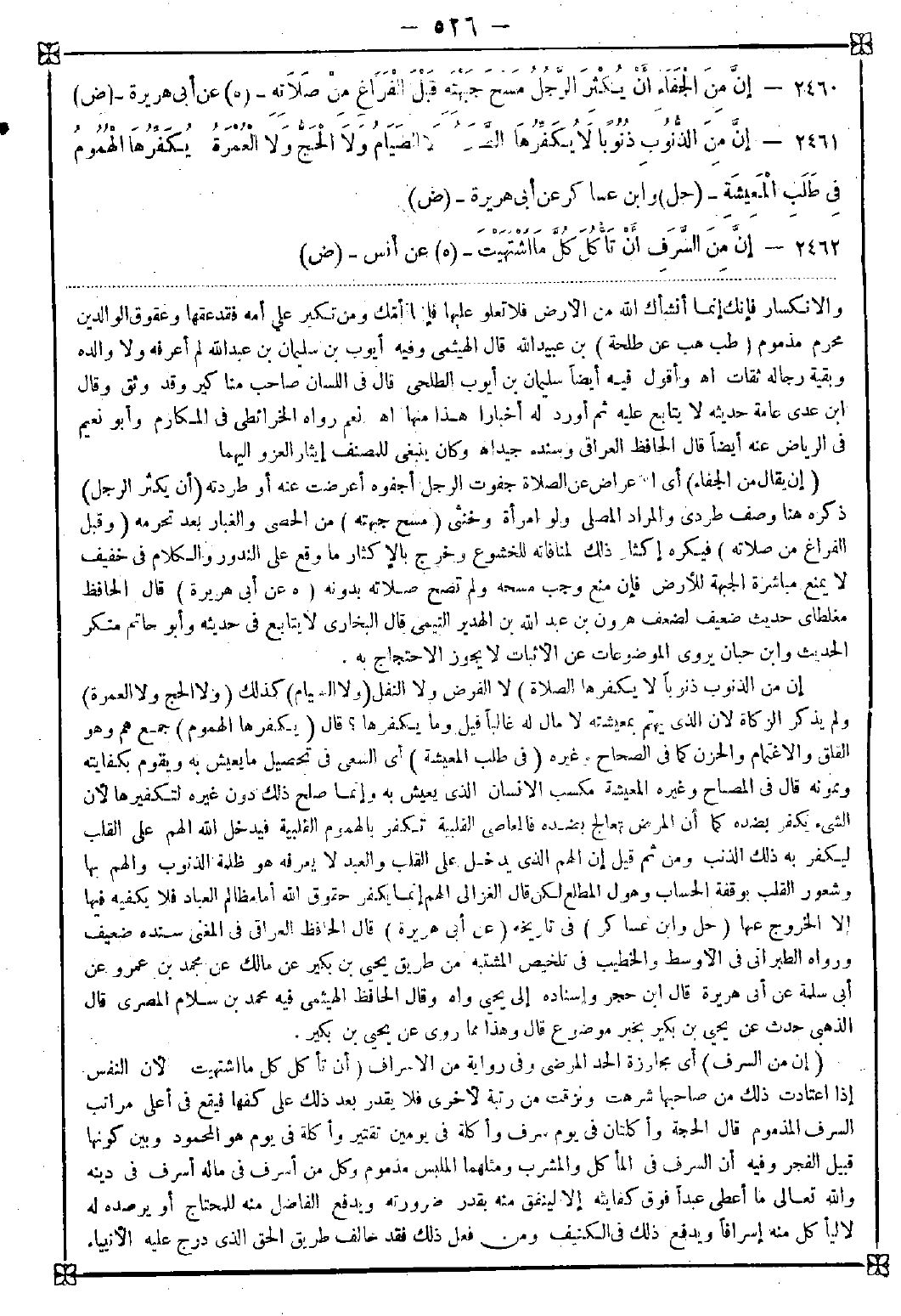 2461 - (إن من الذنوب ذنوبا لا يكفرها الصلاة) لا الفرض ولا النفل (ولا الصيام) كذلك (والحج ولا العمرة) ولم يذكر الزكاة لأن الذي يهتم بمعيشته لا مال له غالبا قيل وما يكفرها؟ قال (يكفرها الهموم) جمع هم وهو القلق والاغتمام والحزن كما في الصحاح وغيره (في طلب المعيشة) أي السعي في تحصيل ما يعيش به ويقوم بكفايته وممونه قال في المصباح وغيره: المعيشة مكسب الإنسان الذي يعيش به وإنما صلح ذلك دون غيره لتكفيرها لأن الشيء يكفر بضده كما أن المرض يعالج بضده فالمعاصي القلبية تكفر بالهموم القلبية فيدخل الله الهم على القلب ليكفر به ذلك الذنب ومن ثم قيل إن الهم الذي يدخل على القلب والعبد لا يعرفه هو ظلمة الذنوب والهم بها وشعور القلب بوقفة الحساب وهول المطلع لكن قال الغزالي: الهم إنما يكفر حقوق الله أما مظالم العباد فلا يكفيه فيها إلا الخروج عنها
