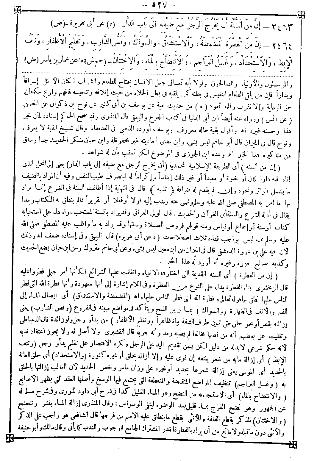 2464 - (إن من الفطرة) أي السنة القديمة التي اختارها الأنبياء واتفقت عليها الشرائع فكأنها أمر جبلي فطروا عليه قال الزمخشري: بناء الفطرة يدل على النوع من الفطرة وفي اللام إشارة إلى أنها معهودة وأنها فطرة الله التي فطر الناس عليها نطق بها قوله تعالى {فطرة الله التي فطر الناس عليها} اه (المضمضة والاستنشاق) أي إيصال الماء إلى الفم والأنف في الطهارة (والسواك) بما يزيل القلح ويتأكد في مواضع مبينة في الفروع (وقص الشارب) يعني إزالته بقص أو نحو حلق حتى تبين طرف الشفة بيانا ظاهرا (وتقليم الأظافر) من يد أو رجل ولو زائدة قال الدمياطي: وتلقيت عن بعضهم أنه من قصها مخالفا لم يصبه رمد وأنه جربه قال القشيري: ولا أصل له ولا يجوز اعتقاد ندبه لأنه حكم شرعي لا بد له من دليل لكن يسن تقديم اليد على الرجل ويكره الاقتصار على تقليم يد أو رجل (ونتف الإبط) أي إزالة ما به من شعر ينتفه إن قوي عليه وإلا أزاله بحلق أو غيره كنورة (والاستحداد) أي حلق العانة بالحديد أي الموسى يعني إزالة شعرها بحديد أو غيره على وزان ما مر وخص الحديد لأن الغالب إزالتها بالحلق به (وغسل البراجم) تنظيف المواضع المنقبضة والمنعطفة التي يجتمع فيها الوسخ وأصلها العقد التي بظهر الأصابع (والانتضاح بالماء) أي الاستنجاء به من النضح وهو الماء القليل كذا في شرح أبي داود للنووي وفي شرح مسلم له عن الجمهور وهو نضح الفرج بماء قليل بعد الوضوء لينفي الوسواس. وقال المنذري: إزالة الماء بنشر وتنحنح (والاختتان) للذكر بقطع القلفة وللأنثى بقطع ما ينطلق عليه الاسم من فرجها قال الشافعي: هو واجب على الذكر والأنثى دون ما قبله ولا مانع من أن يراد بالفطرة القدر المشترك الجامع للوجوب والندب كما يأتي وقال مالك وأبو حنيفة -[528]- سنة وأحمد واجب على الذكر سنة للأنثى