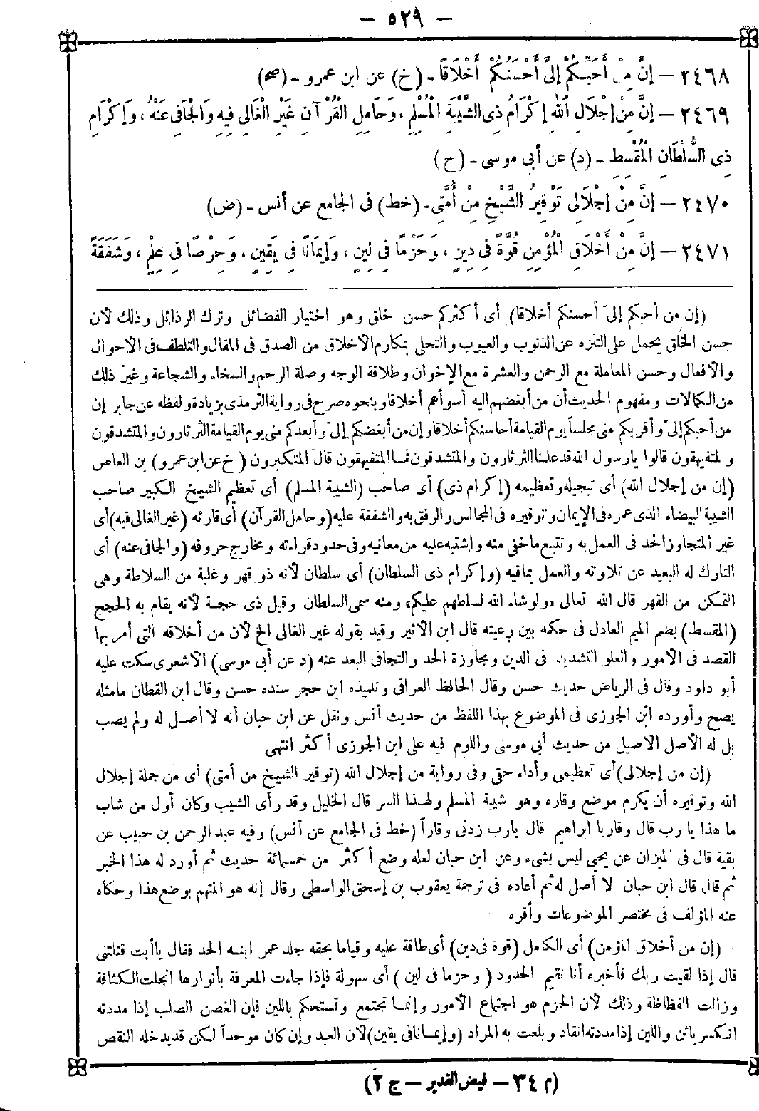 2469 - (إن من إجلال الله) أي تبجيله وتعظيمه (إكرام ذي) أي صاحب (الشيبة المسلم) أي تعظيم الشيخ الكبير صاحب الشيبة البيضاء الذي عمره في الإيمان وتوقيره في المجالس والرفق به والشفقة عليه (وحامل القرآن) أي قارئه (غير الغالي فيه) أي غير المتجاوز الحد في العمل به وتتبع ما خفي منه واشتبه عليه من معانيه وفي حدود قراءته ومخارج حروفه (والجافي عنه) أي التارك له البعيد عن تلاوته والعمل بما فيه (وإكرام ذي السلطان) أي سلطان لأنه ذي قهر وغلبة من السلاطة وهي التمكن من القهر قال الله تعالى {ولو شاء الله لسلطهم عليكم} ومنه سمي السلطان وقيل ذي حجة لأنه يقام به الحجج (المقسط) بضم الميم العادل في حكمه بين رعيته قال ابن الأثير: وقيد بقوله غير الغالي إلخ لأن من أخلاقه التي أمر بها القصد في الأمور والغلو التشديد في الدين ومجاوزة الحد والتجافي البعد عنه