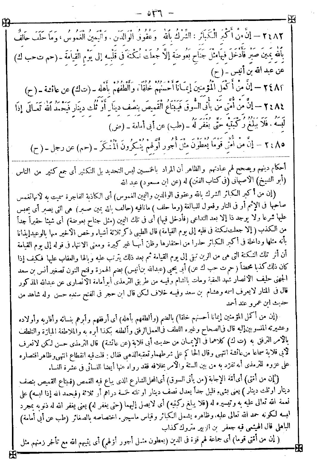 2482 - (إن من أكبر الكبائر الشرك بالله وعقوق الوالدين واليمين الغموس) أي الكاذبة الفاجرة سميت به لأنها تغمس صاحبها في الإثم أو في النار وفعول للمبالغة (وما حلف) ما نافية (حالف بالله يمين صبر) هي التي يصبر أي يحبس عليها شرعا ولا يوجد ذا إلا بعد التداعي (فأدخل فيها) أي في تلك اليمين (مثل جناح بعوضة) أي شيئا حقيرا جدا من الكذب (إلا جعلت نكتة في قلبه إلى يوم القيامة) قال الطيبي: ذكر ثلاثة أشياء وخص الأخير منها بالوعيد إيذانا بأنه مثلها وداخلة في أكبر الكبائر حذرا من احتقارها وظن أنها غير كبيرة ومعنى الانتهاء في قوله إلى يوم القيامة أن أثر تلك النكتة التي هي من الرين تبقى إلى يوم القيامة ثم بعد ذلك يترتب عليه وبالها والعقاب عليها فكيف إذا كان ذلك كذبا محضا