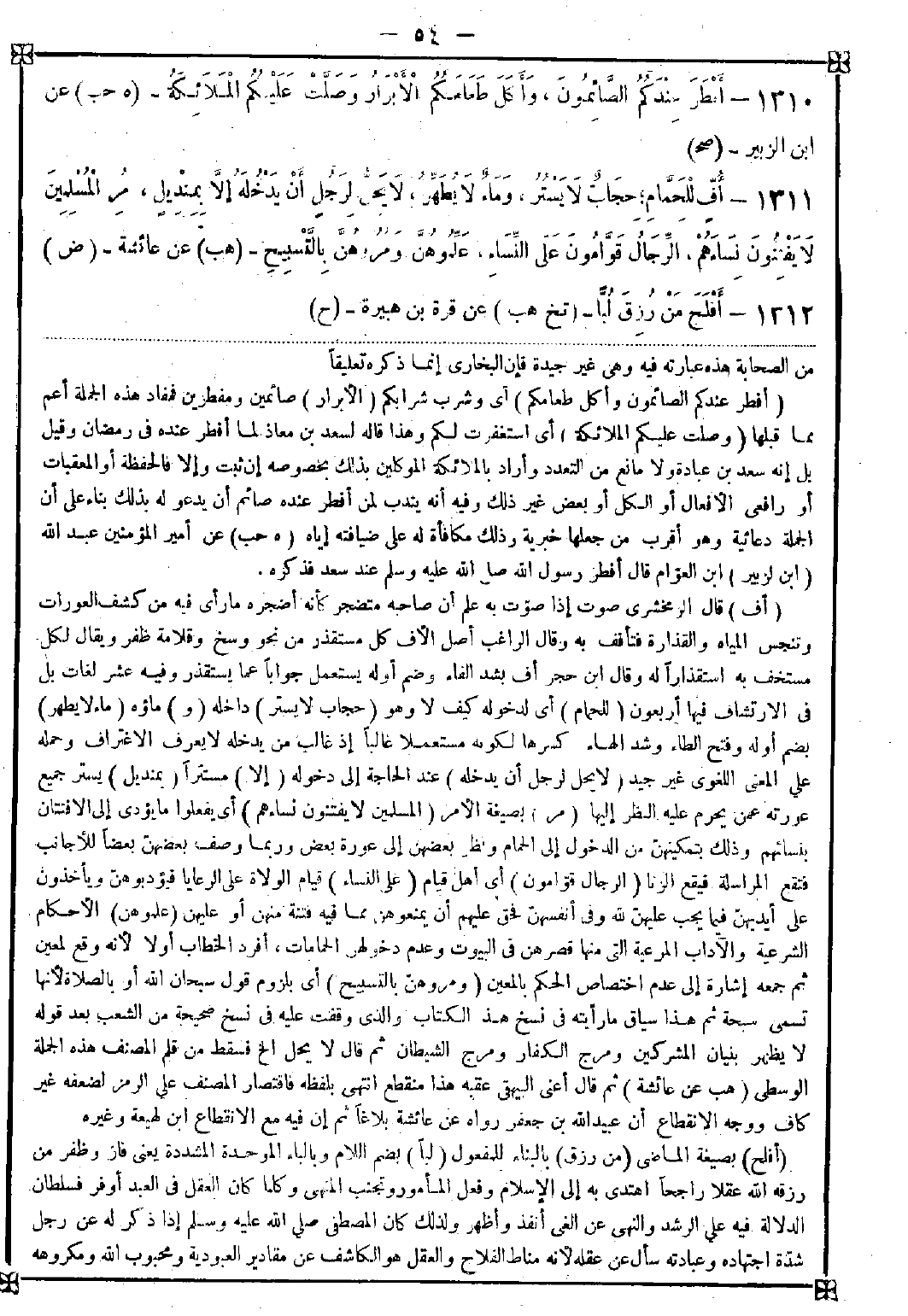 1311 - (أف) قال الزمخشري: صوت إذا صوت به أعلم أن صاحبه متضجر كأنه أضجره ما رأى فيه من كشف العورات وتنجس المياه والقذارة فتأفف به وقال الراغب: أصل الأف كل مستقذر من نحو وسخ وقلامة ظفر ويقال لكل مستخف به استقذارا له وقال ابن حجر: أف بشد الفاء وضم أوله يستعمل جوابا عما يستقذر وفيه عشر لغات بل في الارتشاف فيها أربعون (للحمام) أي لدخوله كيف لا وهو (حجاب لا يستر) داخله (و) ماؤه (ماء لا يطهر) بضم أوله وفتح الطاء وشد الهاء وكسرها لكونه مستعملا غالبا إذ غالب من يدخله لا يعرف الاغتراف وحمله على المعنى اللغوي غير جيد (لا يحل لرجل أن يدخله) عند الحاجة إلى دخوله (إلا) مستترا (بمنديل) يستر جميع عورته عمن يحرم عليه النظر إليها (مر) بصيغة الأمر (المسلمين لا يفتنون نساؤهم) أي يفعلوا ما يؤدي إلى الافتتان بنسائهم وذلك بتمكينهن من الدخول إلى الحمام ونظر بعضهن إلى عورة بعض وربما وصف بعضهن بعضا للأجانب فتقع المراسلة فيقع الزنا (الرجال قوامون) أي أهل قيام (على النساء) قيام الولاة على الرعايا فيؤدبوهن ويأخذون على أيديهن فيما يجب عليهن وفي أنفسهن فحق عليهم أن يمنعوهن مما فيه فتنة منهن أو عليهن (علموهن) الأحكام الشرعية والآداب المرعية التي منها قصرهن في البيوت وعدم دخولهن الحمامات أفرد الخطاب أولا لأنه وقع لمعين ثم جمعه إشارة إلى عدم اختصاص الحكم بالمعين (ومروهن بالتسبيح) أي بلزوم قول سبحان الله أو بالصلاة لأنها تسمى سبحة ثم هذا سياق ما رأيته في نسخ هذا الكتاب والذي وقفت عليه في نسخ صحيحة من الشعب بعد قوله لا يظهر بنيان المشركين ومرج الكفار ومرج الشيطان ثم قال لا يحل إلخ فسقط من قلم المصنف هذه الجملة الوسطى