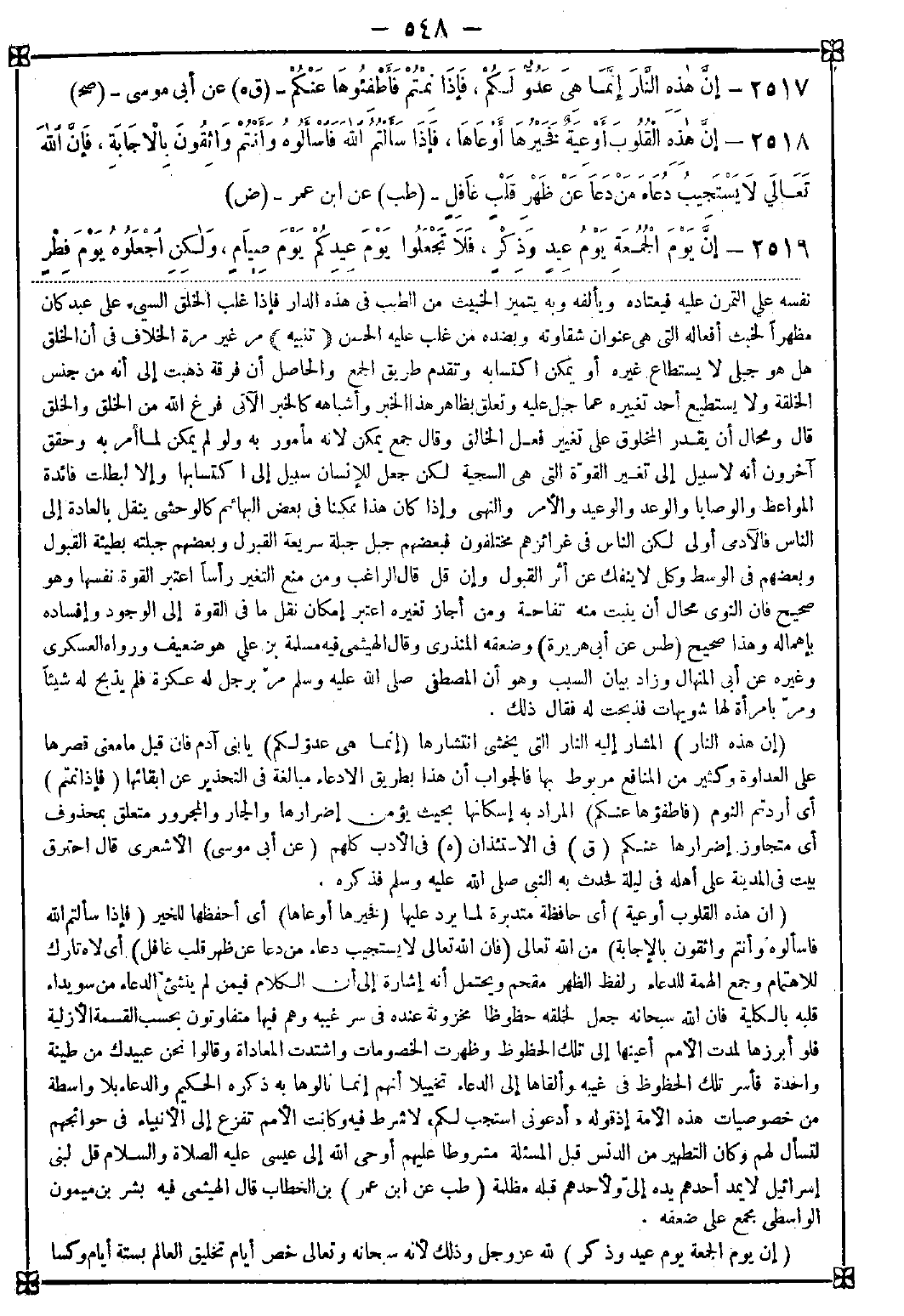 2518 - (إن هذه القلوب أوعية) أي حافظة متدبرة لما يرد عليها (فخيرها أوعاها) أي أحفظها للخير (فإذا سألتم الله فاسألوه وأنتم واثقون بالإجابة) من الله تعالى (فإن الله تعالى لا يستجيب دعاء من دعا عن ظهر قلب غافل) أي لاه تارك للاهتمام وجمع الهمة للدعاء ولفظ الظهر مقحم ويحتمل أنه إشارة إلى أن الكلام فيمن لم ينشئ الدعاء من سويداء قلبه بالكلية فإن الله سبحانه جعل لخلقه حظوظا مخزونة عنده في سر غيبه وهم فيها متفاوتون بحسب القسمة الأزلية فلو أبرزها لمدت الأمم أعينها إلى تلك الحظوظ وظهرت الخصومات واشتدت المعاداة وقالوا نحن عبيدك من طينة واحدة فأسر تلك الحظوظ في غيبه وألقاها إلى الدعاء تخييلا أنهم إنما نالوها به ذكره الحكيم والدعاء بلا واسطة من خصوصيات هذه الأمة إذ قوله {ادعوني أستجب لكم} لا شرط فيه وكانت الأمم تفزع إلى الأنبياء في حوائجهم لتسأل لهم وكان التطهير من الدنس قبل المسألة مشروطا عليهم. أوحى الله إلى عيسى عليه الصلاة والسلام قل لبني إسرائيل لا يمد أحدهم يده إلي ولأحدهم قبله مظلمة