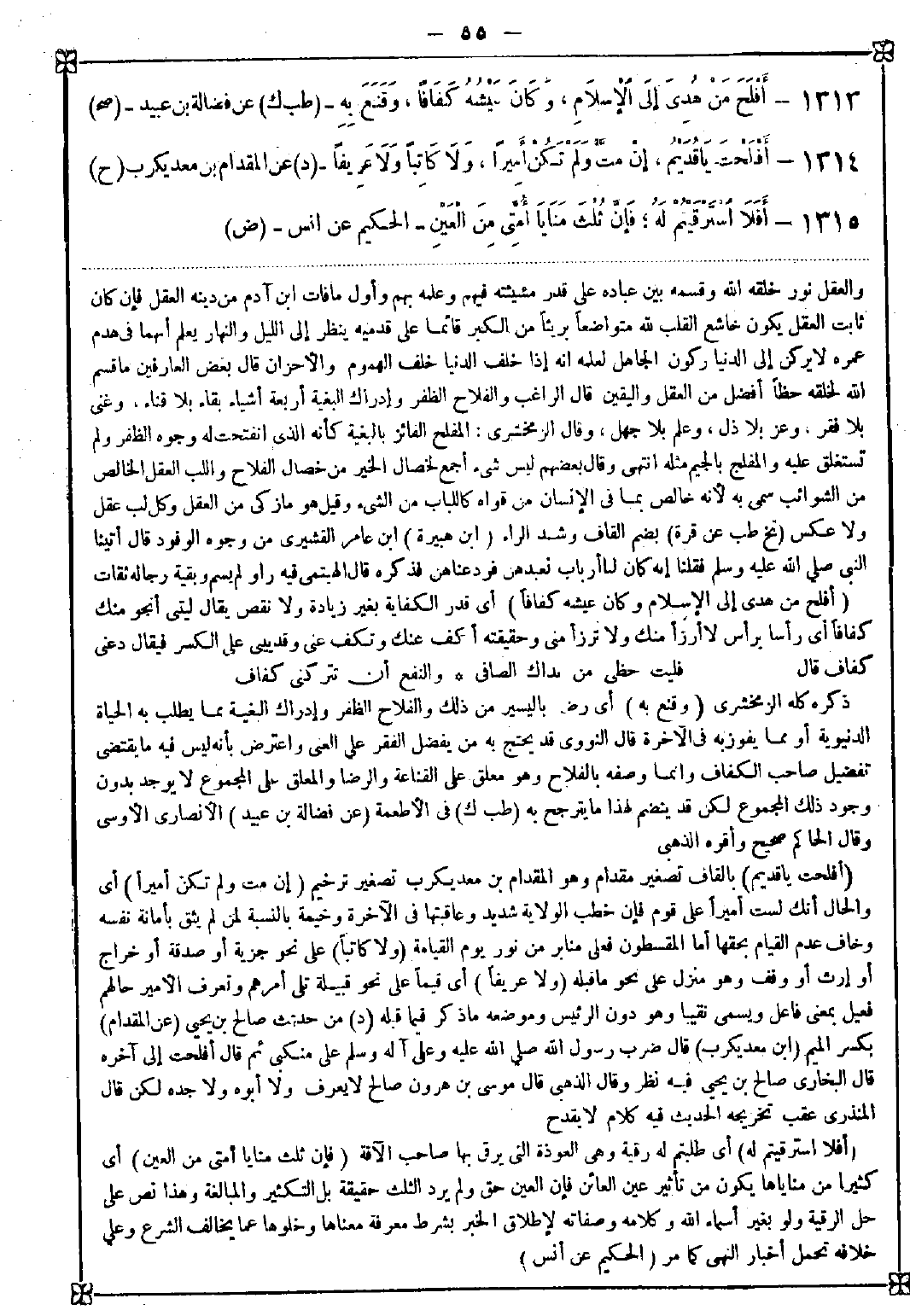 1314 - (أفلحت يا قديم) بالقاف تصغير مقدام وهو المقدام بن معد يكرب تصغير ترخيم (إن مت ولم تكن أميرا) أي والحال أنك لست أميرا على قوم فإن خطب الولاية شديد وعاقبتها في الآخرة وخيمة بالنسبة لمن لم يثق بأمانة نفسه وخاف عدم القيام بحقها أما المقسطون فعلى منابر من نور يوم القيامة (ولا كاتبا) على نحو جزية أو صدقة أو خراج أو إرث أو وقف وهو منزل على نحو ما قبله (ولا عريفا) أي قيما على نحو قبيلة تلي أمرهم وتعرف الأمير حالهم فعيل بمعنى فاعل ويسمى نقيبا وهو دون الرئيس وموضعه ما ذكر فيما قبله
