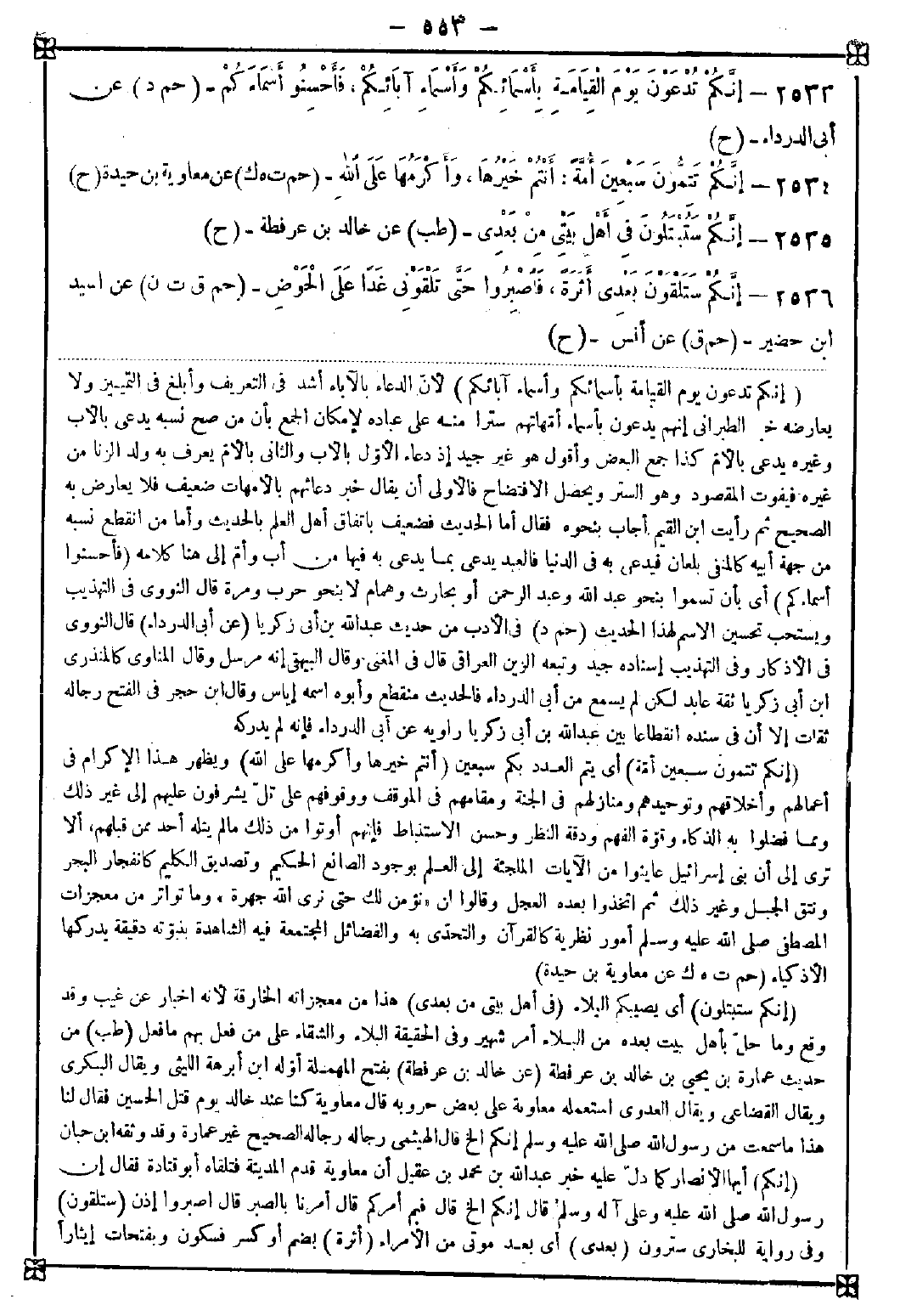 -[553]- 2533 - (إنكم تدعون يوم القيامة بأسمائكم وأسماء آبائكم) لأن الدعاء بالآباء أشد في التعريف وأبلغ في التمييز ولا يعارضه خبر الطبراني إنهم يدعون بأسماء أمهاتهم سترا منه على عبادة لإمكان الجمع بأن من صح نسبه يدعى بالأب وغيره يدعى بالأم كذا جمع البعض وأقول هو غير جيد إذ دعاء الأول بالأب والثاني بالأم يعرف به ولد الزنا من غيره فيفوت المقصود وهو الستر ويحصل الافتضاح فالأولى أن يقال خبر دعائهم بالأمهات ضعيف فلا يعارض به الصحيح ثم رأيت ابن القيم أجاب بنحوه فقال: أما الحديث فضعيف باتفاق أهل العلم بالحديث وأما من انقطع نسبه من جهة أبيه كالمنفي بلعان فيدعى به في الدنيا فالعبد يدعى بما يدعى به فيها من أب وأم إلى هنا كلامه (فأحسنوا أسمائكم) أي بأن تسموا بنحو عبد الله وعبد الرحمن أو بحارث وهمام لا بنحو حرب ومرة قال النووي في التهذيب: ويستحب تحسين الاسم لهذا الحديث
