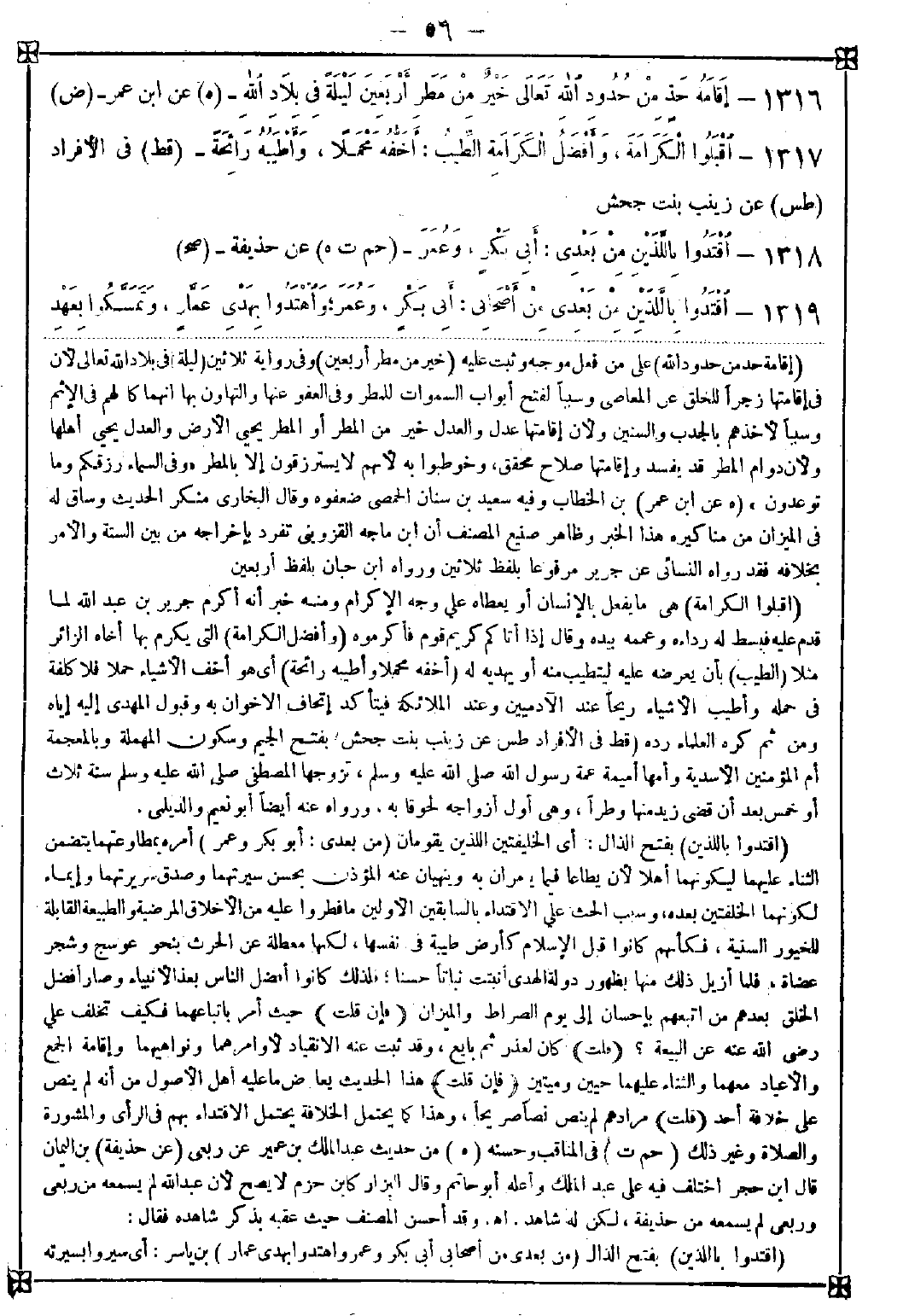 -[56]- 1316 - (إقامة حد من حدود الله) على من فعل موجبه وثبت عليه (خير من مطر أربعين) وفي رواية ثلاثين (ليلة) في بلاد الله تعالى لأن في إقامتها زجرا للخلق عن المعاصي وسببا لفتح أبواب السماوات للمطر وفي العفو عنها والتهاون بها انهماكا لهم في الإثم وسببا لأخذهم بالجدب والسنين ولأن إقامتها عدل وخير من المطر أو المطر يحيي الأرض والعدل يحيي أهلها ولأن دوام المطر قد يفسد وإقامتها صلاح محقق وخوطبوا به لأنهم لا يسترزقون إلا بالمطر {وفي السماء رزفكم وما توعدون}