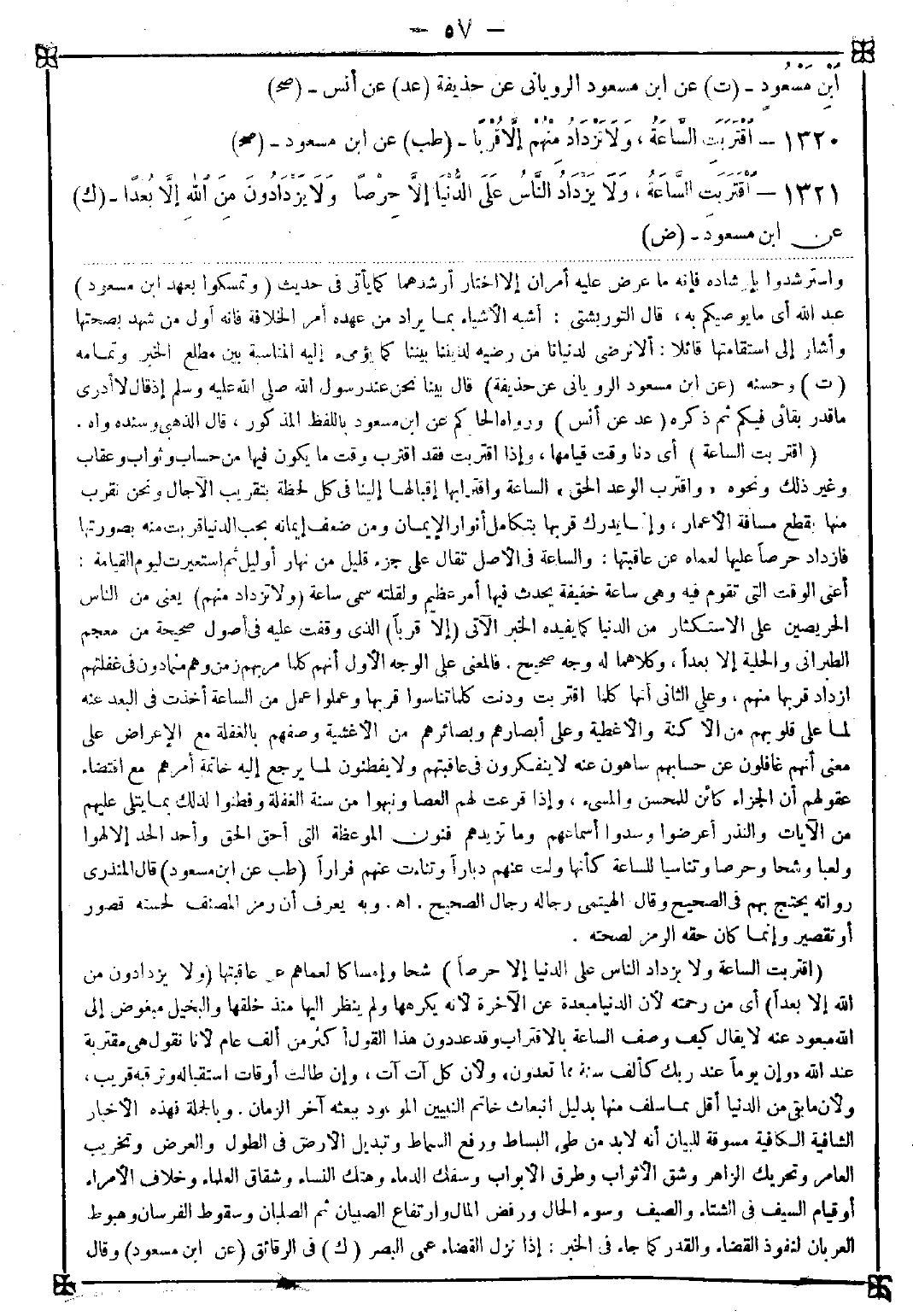 1321 - (اقتربت الساعة ولا يزداد الناس على الدنيا إلا حرصا) شحا وإمساكا لعماهم عن عاقبتها (ولا يزدادون من الله إلا بعدا) أي من رحمته لأن الدنيا مبعدة عن الآخرة لأنه يكرهها ولم ينظر إليها منذ خلقها والبخيل مبغوض إلى الله مبعود عنه لا يقال كيف وصف الساعة بالاقتراب وقد عددون هذا القول أكثر من ألف عام لأنا نقول هي مقتربة عند الله {وإن يوما عند ربك كألف سنة مما تعدون} ولأن كل آت آت وإن طالت أوقات استقباله وترقبه قريب ولأن ما بقي من الدنيا أقل مما سلف منها بدليل انبعاث خاتم النبيين الموعود ببعثه آخر الزمان. وبالجملة فهذه الأخبار الشافية الكافية مسوقة للبيان أنه لابد من طي البساط ورفع السماط وتبديل الأرض في الطول والعرض وتخريب العامر وتحريك الزاهر وشق الأثواب وطرق الأبواب وسفك الدماء وهتك النساء وشقاق العلماء وخلاف الأمراء أو قيام السيف في الشتاء والصيف وسوء الحال ورفض المال وارتفاع الصبيان ثم الصلبان وسقوط الفرسان وهبوط العربان لنفوذ القضاء والقدر كما جاء في الخبر: إذا نزل القضاء عمي البصر