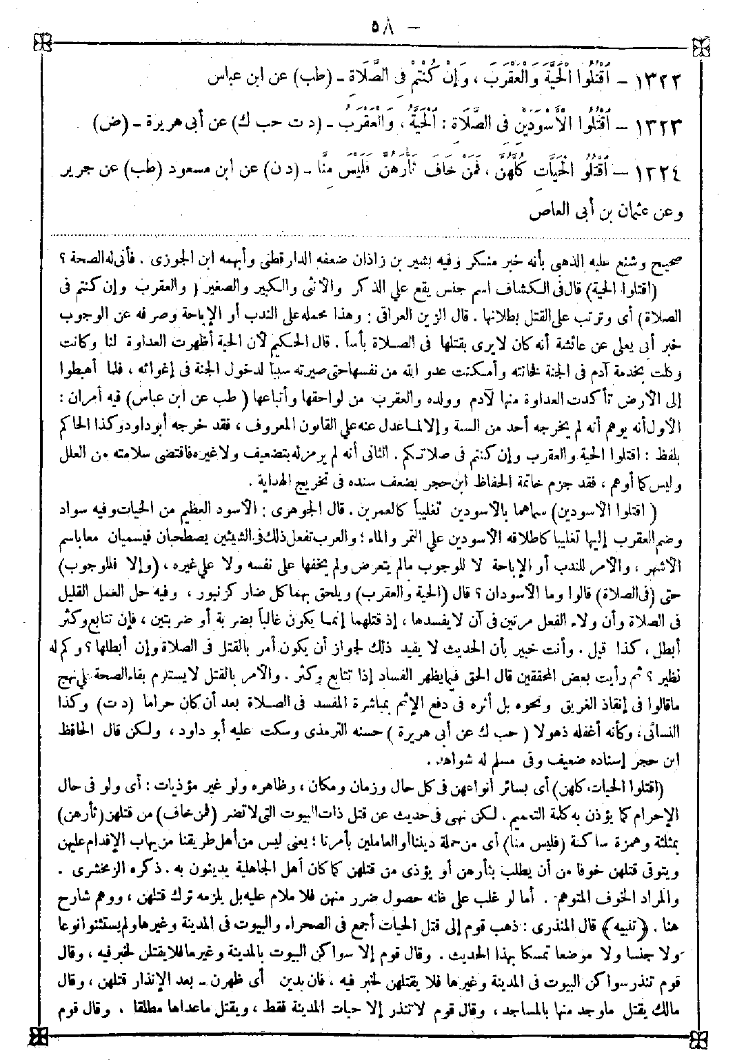 1323 - (اقتلوا الأسودين) سماهما بالأسودين تغليبا كالعمرين. قال الجوهري: الأسود العظيم من الحيات وفيه سواد وضم العقرب إليها تغليبا كإطلاقه الأسودين على التمر والماء والعرب تفعل ذلك في الشيئين يصطحبان فيسميان معا باسم الأشهر والأمر للندب أو الإباحة لا للوجوب ما لم يتعرض ولم يخفها على نفسه ولا على غيره (وإلا فللوجوب) حتى (في الصلاة) قالوا: وما الأسودان؟ قال (الحية والعقرب) ويلحق بهما كل ضار كزنبور وفيه حل العمل القليل في الصلاة وأن ولاء الفعل مرتين في آن لا يفسدها إذ قتلهما إنما يكون غالبا بضربة أو ضربتين فإن تتابع وكثر أبطل كذا قيل وأنت خبير بأن الحديث لا يفيد ذلك لجواز أن يكون أمر بالقتل في الصلاة وإن أبطلها؟ وكم له نظير؟ ثم رأيت بعض المحققين قال الحق فيما يظهر الفساد إذا تتابع وكثر والأمر بالقتل لا يستلزم بقاء الصحة على نهج ما قالوا في إنقاذ الغريق ونحوه بل أثره في دفع لإثم بمباشرة المفسد في الصلاة بعد أن كان حراما