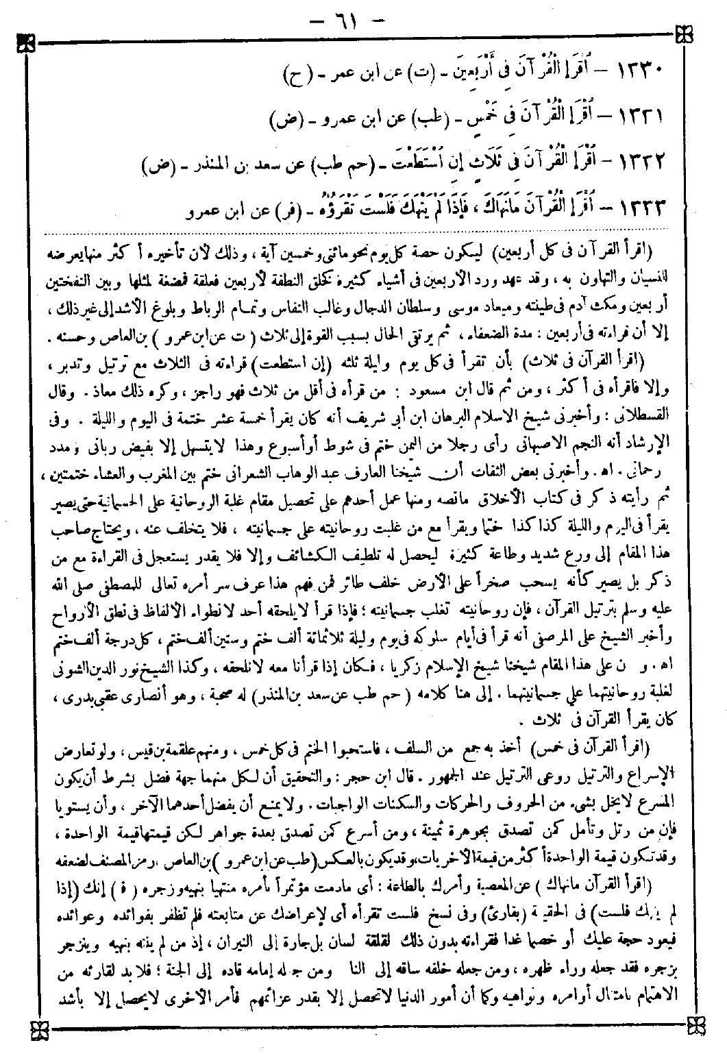 -[61]- 1230 - (اقرأ القرآن في كل أربعين ليلة) ليكون حصة كل يوم نحو مائتي وخمسين آية وذلك لأن تأخيره أكثر منها يعرضه للنسيان والتهاون به وقد عهد ورد الأربعين أشياء كثيرة كخلق النطفة لأربعين فعلقة فمضغة لمثلها وبين النفختين أربعين ومكث آدم في طينته وميعاد موسى وسلطان الدجال وغالب النفاس وتمام الرباط وبلوغ الأشد إلى غير ذلك إلا أن قراءته في أربعين: مدة الضعفاء ثم يرتقي الحال بسبب القوة إلى ثلاث