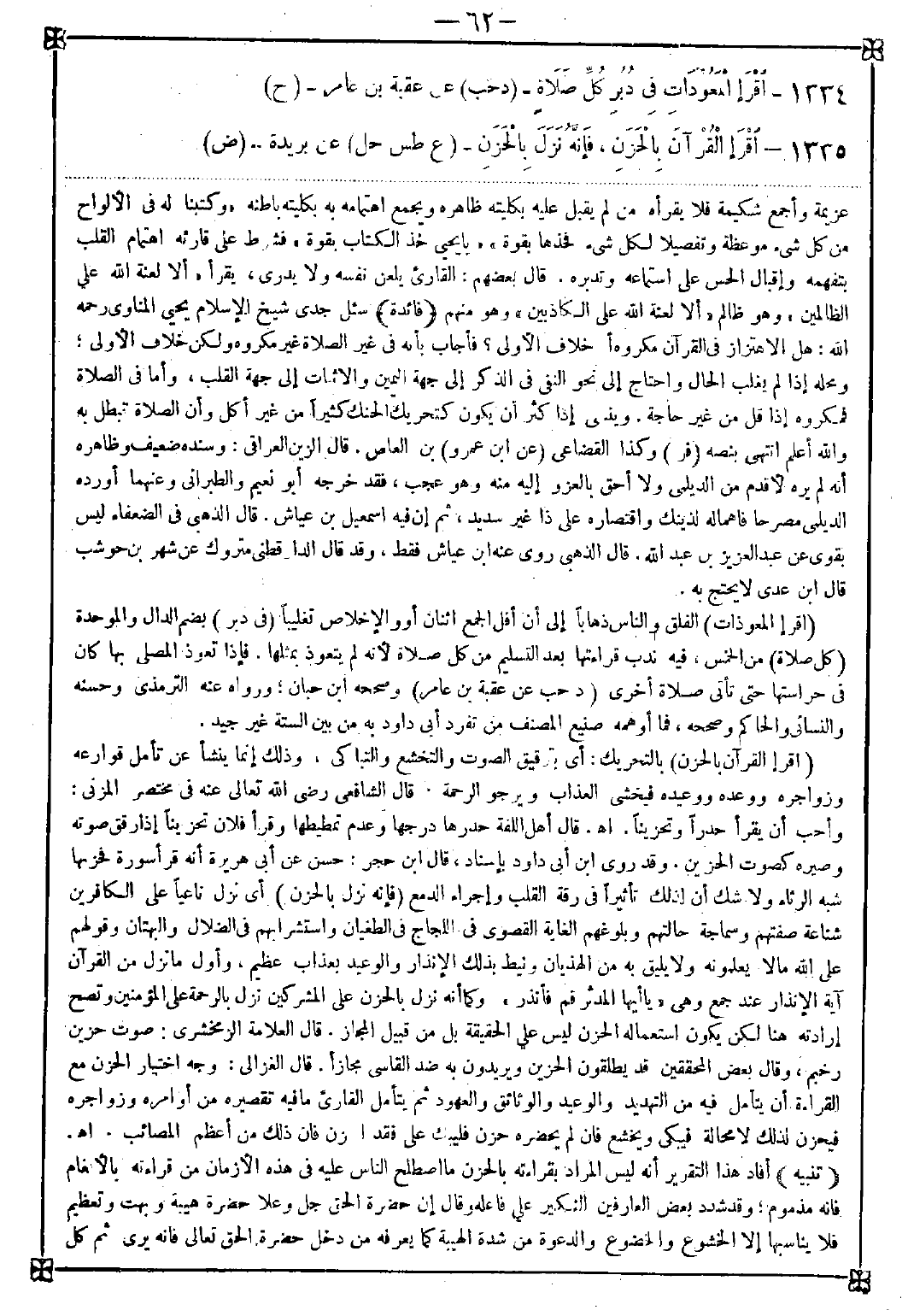 1335 - (اقرأ القرآن بالحزن) بالتحريك: أي بترقيق الصوت والتخشغ والتباكي وذلك إنما ينشأ عن تأمل قوارعه وزواجره ووعده ووعيده فيخشى العذاب ويرجو الرحمة. قال الشافعي رضي الله تعالى عنه في مختصر المزني: وأحب أن يقرأ حدرا وتحزينا. اه. قال أهل اللغة: حدرها درجها وعدم تمطيطها وقرأ فلان تحزينا إذا رقق صوته وصيره كصوت الحزين. وقد روى ابن أبي داود بإسناد قال ابن حجر: حسن عن أبي هريرة أنه قرأ سورة فحزنها شبه الرثاء ولا شك أن لذلك تأثيرا في رقة القلب وإجراء الدمع (فإنه نزل بالحزن) أي نزل ناعيا على الكافرين شناعة صفتهم وسماجة حالتهم وبلوغهم الغاية القصوى في اللجاج في الطغيان واستشرابهم في الضلال والبهتان وقولهم على الله ما لا يعلمونه ولا يليق به من الهذيان ونيط بذلك الإنذار والوعيد بعذاب عظيم وأول ما نزل من القرآن آية الإنذار عند جمع وهي {يا أيها المدثر قم فأنذر} وكما أنه نزل بالحزن على المشركين نزل بالرحمة على المؤمنين وتصح إرادته هنا لكن يكون استعماله الحزن ليس على الحقيقة بل من قبيل المجاز. قال العلامة الزمخشري: صوت حزين رخيم وقال بعض المحققين: قد يطلقون الحزين ويريدون به ضد القاسي مجازا. قال الغزالي: وجه اختيار الحزن مع القراءة أن يتأمل فيه من التهديد والوعيد والوثائق والعهود ثم يتأمل القارىء ما فيه تقصيره من أوامره وزواجره فيحزن لذلك لا محالة فيبكي ويخشع فإن لم يحضره حزن فليبك على فقد الحزن فإن ذلك من أعظم المصائب. اه. <تنبيه> أفاد هذا التقرير أنه ليس المراد بقراءته بالحزن ما اصطلح الناس عليه في هذه الأزمان من قراءته بالأنغام فإنه مذموم وقد شدد بعض العارفين النكير على فاعله وقال إن حضرة الحق جل وعلا حضرة هيبة وبهت وتعظيم فلا يناسبها إلا الخشوع والخضوع والدعوة من شدة الهيبة كما يعرفه من دخل حضرة الحق تعالى فإنه يرى ثم كل -[63]- ملك لو وضع قدمه في الأرض ما وسعته ولو بلغ السماوات والأرض في بطنه لنزلت من حلقه ومع ذلك فهو يرعد من هيبة الله تعالى كالقصبة في الريح العاصف: فسبحان من حجبنا عن شهود كمال عظمته رحمة بنا فإنه لو كشف لنا عن عظمة ما فوق طاقتنا لاضمحلت أبداننا وذابت عظامنا ولو استحضر القارىء عظمة ربه حال قراءته ما استطاع أن يفعل ذلك