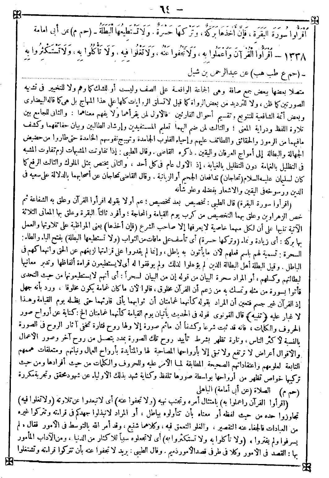 1338 - (اقرأوا القرآن واعملوا به) بامتثال أمره وتجنب نهيه (ولا تجفوا عنه) أي لا تبعدوا عن تلاوته (ولا تغلوا فيه) تجاوزوا حده من حيث لفظه أو معناه بأن تتأولوه بباطل أو المراد لا تبذلوا جهدكم في قراءته وتتركوا غيره من العبادات فالجفاء عنه التقصير والغلو التعمق فيه وكلاهما شنيع وقد أمر الله بالتوسط في الأمور فقال {لم يسرفوا ولم يقتروا} (ولا تأكلوا به ولا تستكثروا به) أي لا تجعلوه سببا للإكثار من الدنيا ومن الآداب المأمور بها: القصد في الأمور وكلا في طرفي قصد الأمور ذميم. وقال الطيبي: يريد لا تجفوا عنه بأن تتركوا قراءته وتشتغلوا -[65]- بتأويله وتفسيره. ولا تغلوا فيه بأن تبذلوا جهدكم في قراءته وتجويده من غير تفكر كما قال في الحديث الآخر لم يفقه من قرأ القرآن في أقل من ثلاث