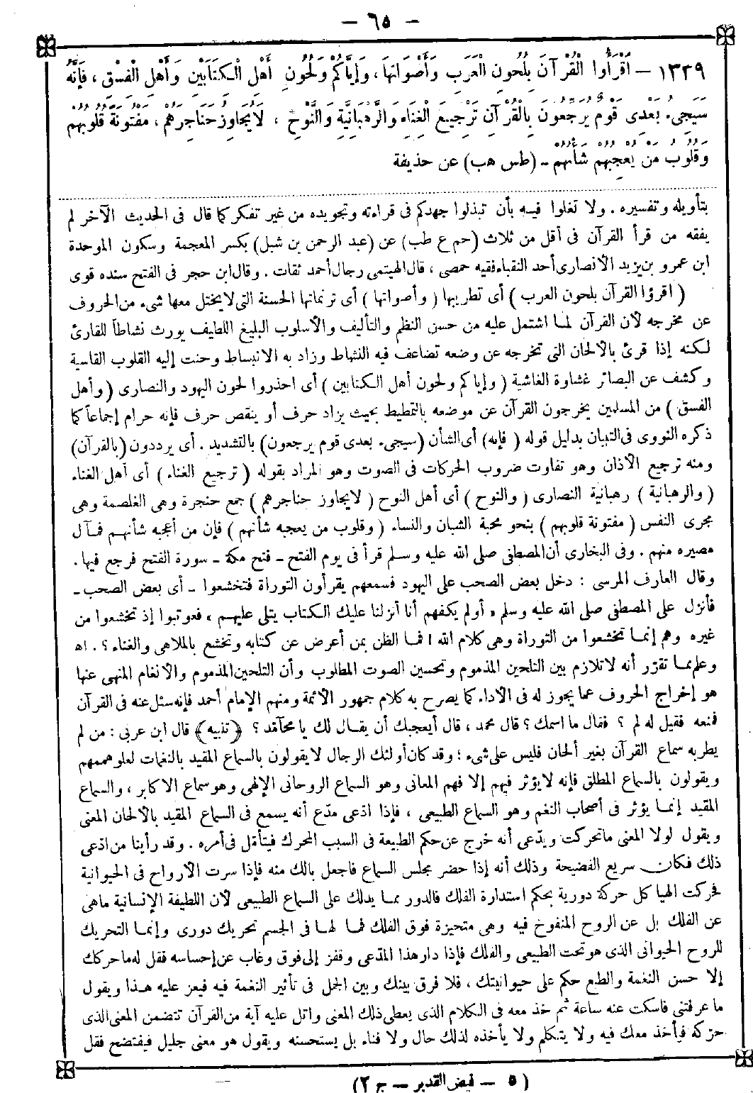 1339 - (اقرأوا القرآن بلحون العرب) أي تطريبها (وأصواتها) أي ترنماتها الحسنة التي لا يختل معها شيء من الحروف عن مخرجه لأن القرآن لما اشتمل عليه من حسن النظم والتأليف والأسلوب البليغ اللطيف يورث نشاطا للقارىء لكنه إذا قرىء بالألحان التي تخرجه عن وضعه تضاعف فيه النشاط وزاد به الإنبساط وحنت إليه القلوب القاسية وكشف عن البصائر غشاوة الغاشية (وإياكم ولحون أهل الكتابين) أي احذروا لحون اليهود والنصارى (وأهل الفسق) من المسلمين يخرجون القرآن عن موضعه بالتمطيط بحيث يزاد حرف أو ينقص حرف فإنه حرام إجماعا كما ذكره النووي في التبيان بدليل قوله (فإنه) أي الشأن (سيجيء بعدي قومي يرجعون) بالتشديد. أي يرددون (بالقرآن) ومنه ترجيع الأذان وهو تفاوت ضروب الحركات في الصوت وهو المراد بقوله (ترجيع الغناء) أي أهل الغناء (والرهبانية) يعني رهبانية النصارى (والنوح) أي أهل النوح (لا يجاوز حناجرهم) جمع حنجرة وهي الغلصمة وهي مجرى النفس (مفتونة قلوبهم) بنحو محبة الشبان والنساء (وقلوب من يعجبه شأنهم) فإن من أعجبه شأنهم فمآل مصيره منهم. وفي البخاري أن المصطفى صلى الله عليه وسلم قرأ في يوم الفتح - فتح مكة - سورة الفتح فرجع فيها. وقال العارف المرسي: دخل بعض الصحب على اليهود فسمعهم يقرؤون التوراة فتخشعوا - أي بعض الصحب - فأنزل على المصطفى صلى الله عليه وسلم {أولم يكفهم أنا أنزلنا عليك الكتاب يتلى عليهم} فعوتبوا إذ تخشعوا من غيره وهم إنما تخشعوا من التوراة وهي كلام الله فما الظن بمن أعرض عن كتابه وتخشع بالملاهي والغناء؟ . اه. وعلم مما تقرر انه لا تلازم بين التلحين المذموم وتحسين الصوت المطلوب وأن التلحين المذموم والأنغام المنهي عنها هو إخراج الحروف عما يجوز له في الأداء كما يصرح به كلام جمهور الأئمة ومنهم الإمام أحمد فإنه سئل عنه في القرآن فمنعه فقيل له: لم؟ فقال: ما اسمك؟ قال: محمد قال: أيعجبك أن يقال لك يا محآمد؟ <تنبيه> قال ابن عربي: من لم يطربه سماع القرآن بغير ألحان فليس على شيء وقد كان أؤلئك الرجال لا يقولون بالسماع المقيد بالنغمات لعلو هممهم ويقولون بالسماع المطلق فإنه لا يؤثر فيهم إلا فهم المعاني وهو السماع الروحاني الإلهي وهو سماع الأكابر والسماع المقيد إنما يؤثر في أصحاب النغم وهو السماع الطبيعي فإذا ادعى مدع أنه يسمع في السماع المقيد بالألحان المعنى ويقول لولا المعنى ما تحركت ويدعي أنه خرج عن حكم الطبيعة في السبب المحرك فيتأمل في أمره. وقد رأينا من ادعى ذلك فكان سريع الفضيحة وذلك أنه إذا حضر مجلس السماع فاجعل بالك منه فإذا سرت الأرواح في الحيوانية فحركت الهياكل حركة دورية بحكم اسستدارة الفلك فالدور مما يدلك على السماع الطبيعي لأن اللطيفة الإنسانية ما هي عن الفلك بل عن الروح المنفوخ فيه وهي متحيزة فوق الفلك فما لها في الجسم تحريك دوري وإنما التحريك للروح الحيواني الذي هو تحت الطبيعي والفلك فإذا دار هذا المدعي وقفز إلى فوق وغاب عن احساسه فقل له ما حركك إلا حسن النغمة والطيع حكم على حيوانيتك فلا فرق بينك وبين الجمل في تأثير النغمة فيه فيعز عليه هذا ويقول ما عرفتني فأسكت عنه ساعة ثم خذ معه في الكلام الذي يعطي ذلك المعنى واتل عليه آية من القرآن تتضمن المعنى الذي حركه فيأخذ معك فيه ولا يتكلم ولا يأخذه لذلك حال ولا فناء بل يستحسنه ويقول هو معنى جليل فيفتضح فقل -[66]- له هذا المعنى هو الذي حركك في السماع البارحة بإجابة القوال في شعره بنغمته فلأي معنى سرى فيك ذاك ولم يسر فيك من سماع كلام الحق بل كنت البارحة يتخبطك الشيطان من المس والسماع الإلهي إذا ورد وارده فعليه في الجسم أن يضجعه لا غير ويغيبه عن احساسه ولا تصدر منه حركة أصلا هبه من الكبار والصغار فعلم أن الوارد الطبيعي تحركه الحركة الدورية والهيمان الإلهي يضجعه فقط لأن الإنسان خلق من تراب وقيامه وقعوده يبعده عن أصله الذي نشأ منه فإذا جاءه الوارد الإلهي وهو صفة القيومية وهي في الإنسان من حيث جسمه بحكم العرض وروحه المدبر هو الذي يقيمه ويقعده فإذا اشتغل الروح المد